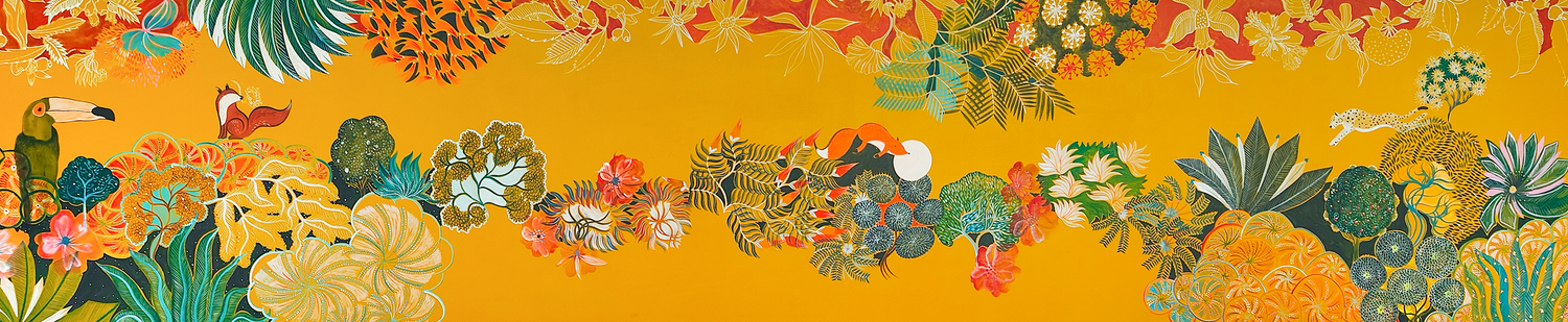 The forest in all its richness and diversity takes vital importance in Priyanka Aelay’s paintings. The lush terrain is visible in vast expanses, revealing the presence of fauna amidst the vegetation – a fox here, a tiger there, a jewel-like bird peeping from within the multihued foliage. The delicacy and scale of these creatures emphasises the larger-than-life quality of their surroundings, building on an atmosphere of abundance and growth. Working with fine layers of acrylic pigments on linen canvas, she creates landscapes that bring together the real and imaginary, the tangible and intangible