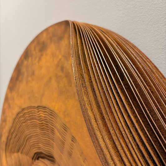 The exploration of metal in sculptural form has been one of the preoccupations of artist Janardhanan Rudhramoorthy, over the last decade. Deeply inspired by nature, he has found various means to adapt the hard and heavy medium into visibly fluid and dynamic objects. Coming from a background in painting, Jana was drawn to processes of three-dimensionality that translated and presented his concepts in ways beyond the surface of a canvas. This led to interesting experiments early in his career, including composite forms like the creation of a beehive with nails on wood, and meticulously shaped wire arrangements representing human anatomy. As he expertly pursues potential shapes and figures, Jana’s grammar has grown to accommodate visual and material paradoxes. Solid iron is teased into softness, furthering the experience of malleable matter that can bend and turn with ease. Dense sheets of metal are forged into multiple slender strips, developing the illusion of transparency and graceful movement. Despite the large scale, many forms are sculpted and displayed to emulate lightness and the lack of gravity, defying the nature of the material. Finally, the sturdy pieces often showcase an organic patina of rust, referring to the impermanence of anything in this world that chemically reacts to the atmosphere around it, slowly but surely....In his work, the motif of the nest has consistently been a metaphor for the body. In both paintings and sculptures, Jana has explored the idea that human consciousness and selfhood resides within this bodily container; it is protected as well as hidden, with layers or glimpses being revealed and discovered. Deep observation of everything around him has been one of the key elements to his artistic process from the start. Finding the body compelling and beautiful, he often makes studies and tracings of himself. The resultant works bring about a philosophical engagement with the complexity of the human persona - its internal and external, physical and spiritual traits. Acknowledging the form’s existence as an idea even before the idea takes a physical shape, Jana explains, “This idea of physical absence/presence fascinates me and I translate this concept into my work using the notion of a trace. The trace is both a presence and an absence and I bring this to my work by literally tracing the body impression on iron.” Behind the smoothly finished sculptures is a process that can be lengthy and labour-intensive, necessitating mechanical precision, technical collaboration along with structural understanding of the medium and space, particularly for those working in expansive scale. For Jana, each series of works brings about fresh learnings and sharper insight, as he moves through the journey from envisioning through drawing and maquette making, to the execution stage with the production of parts, assembling, and finally displaying, with his team. With a post-graduation from the Government College of Fine Arts, Chennai, and fifteen years of experimentation, Jana believes that the meaning of art comes from sharing experiences and knowledge. He has built a unique language that communicates the very essence of spatial balance and visual synchrony.