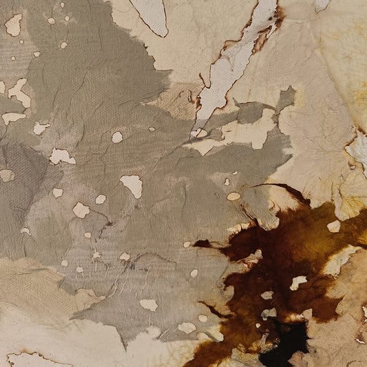 Madhuri Kathe’s paintings are an outpouring of her mystical insights, spiritual experiences and revelations. All of her paintings begin with nature and its unscripted nuances, and her readings and understanding of spiritual texts and scriptures. ... The process through which she creates her art is akin to a meditative state where she spontaneously connects with colours and the canvas in a lilting, expressionist tango. The abstract paintings which follow these personal experiences are cryptic illustrations of her unique perceptions. A verse in the Bhagavad Gita, a rock, mountain or seascape – each of these shapes her free-flowing, non-figurative works. Kathe believes that the concept of “macrocosm and microcosms” holds infinite possibilities for artists and thinkers. Awash in a symphony of liquid amber, earth tones and ethereal blues, she perceives the world as transient, emphasising the supremacy and eternity of the mind.