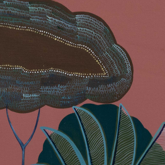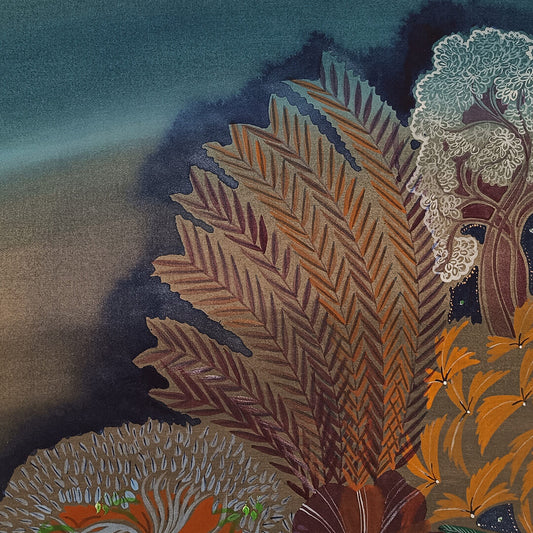 Priyanka Aelay’s acrylic works unfold like magic realist tales filled with birds, beasts, animals, trees and flowers in bold, vibrant colours. Her mythical, enchanted forests are filled with intricate motifs, exquisite patterns and striking imagery. ... On her canvas, age-old folk heritage — particularly from Telangana, from where she hails — is transformed into something that is distinctly contemporary and wholly unique, as she seeks inspiration from the environment and indigenous flora and fauna. Aelay’s paintings reflect the energy, momentum and simplicity of folk art, as well as the aesthetics and language of contemporary art. Paintings do not follow a linear perspective in the artist’s work, as she plays with space, dimensions and perspective to make the landscapes appear free flowing and free floating. Aelay’s works are an invitation to transport and immerse yourself in the unboundedness of nature and the wilderness, something sorely lacking in our urban ecosystems.