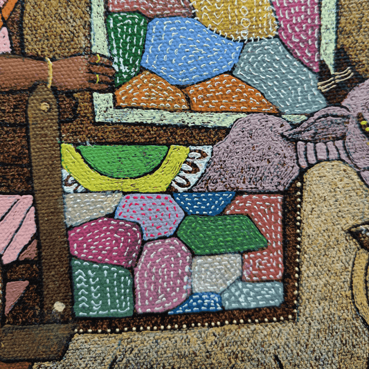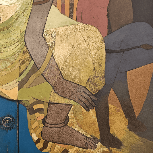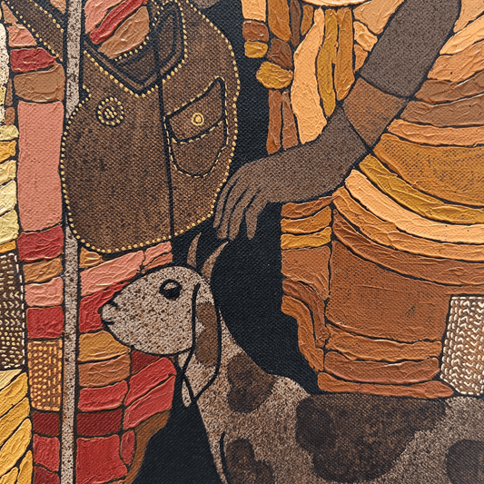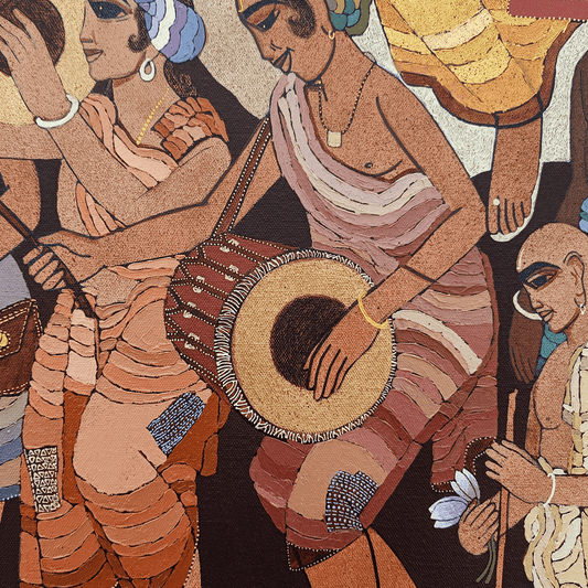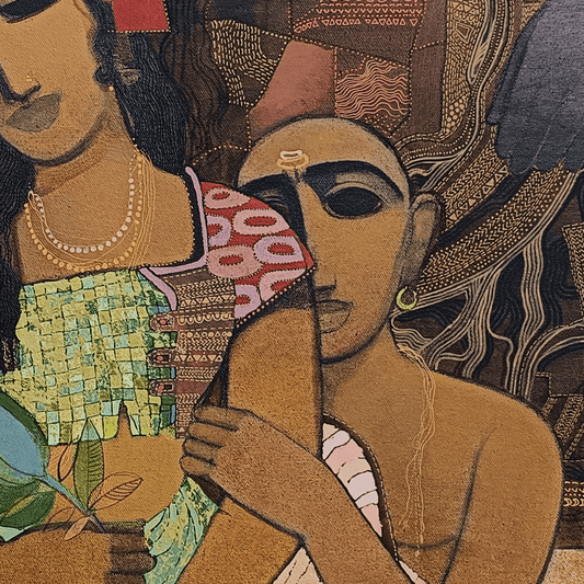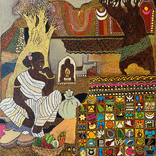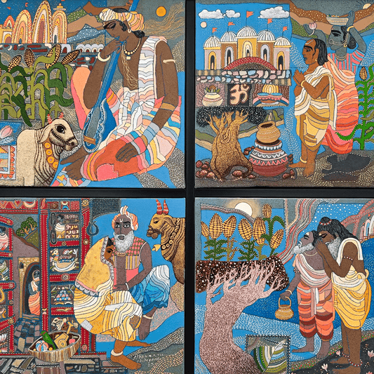 Siddharth Shingade recreates Tuljapur, where he grew up, in his artworks as he remembers it – through the prism of his memories, visions and imagination. Imbued with nostalgia, his richly layered acrylics celebrate the resilience of his people. ... Toy sellers, farmers, gipsies and everyday folk are recurring protagonists in his work, as are mythological beings like Krishna, Govardhan and Buddha. Mythology is seamlessly woven into rustic scenes – the characters in Shingade’s timeless world are part-earthly and part-mythical, and in a state of oneness with the landscape around them. His works are rooted in the vast, drought-prone region of his homeland, Marathwada — an ode to its land, soil, light, people and way of life. Clothed in diaphanous textures and mesmerising gradations of colour, the dusky figures with kohl-rimmed eyes are depicted in the dark tones of the soil that pervades this region. Steeped in mood, emotion and lyricism, his art goes beyond sentimentalism and honours the artistic heritage of the region, the rustic, now-forgotten ways of life, and the endurance of the people from this arid landscape.