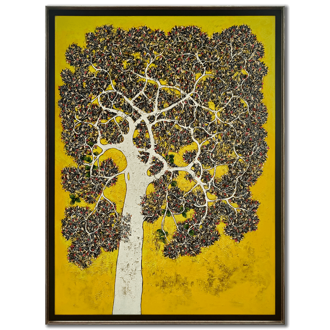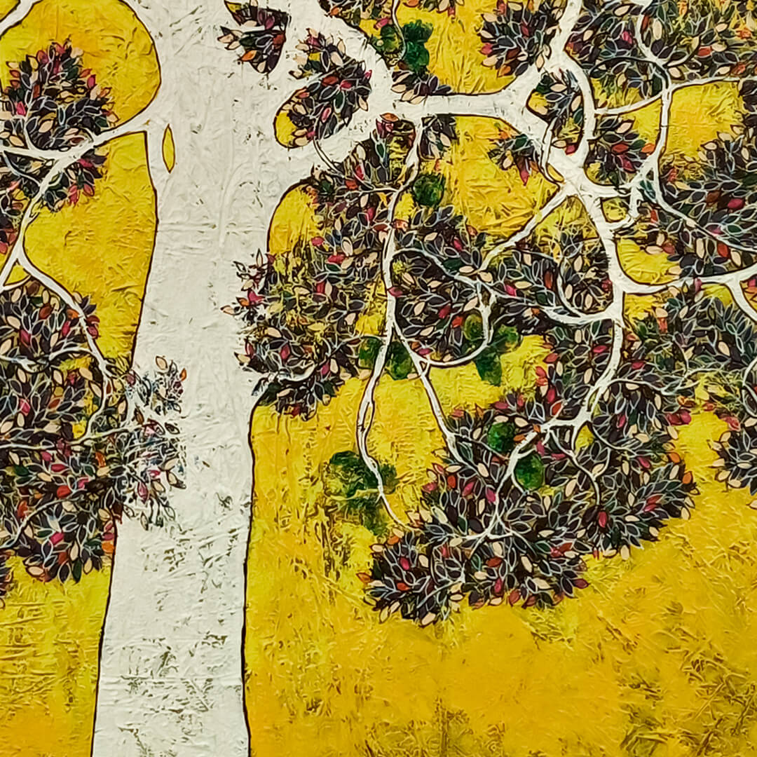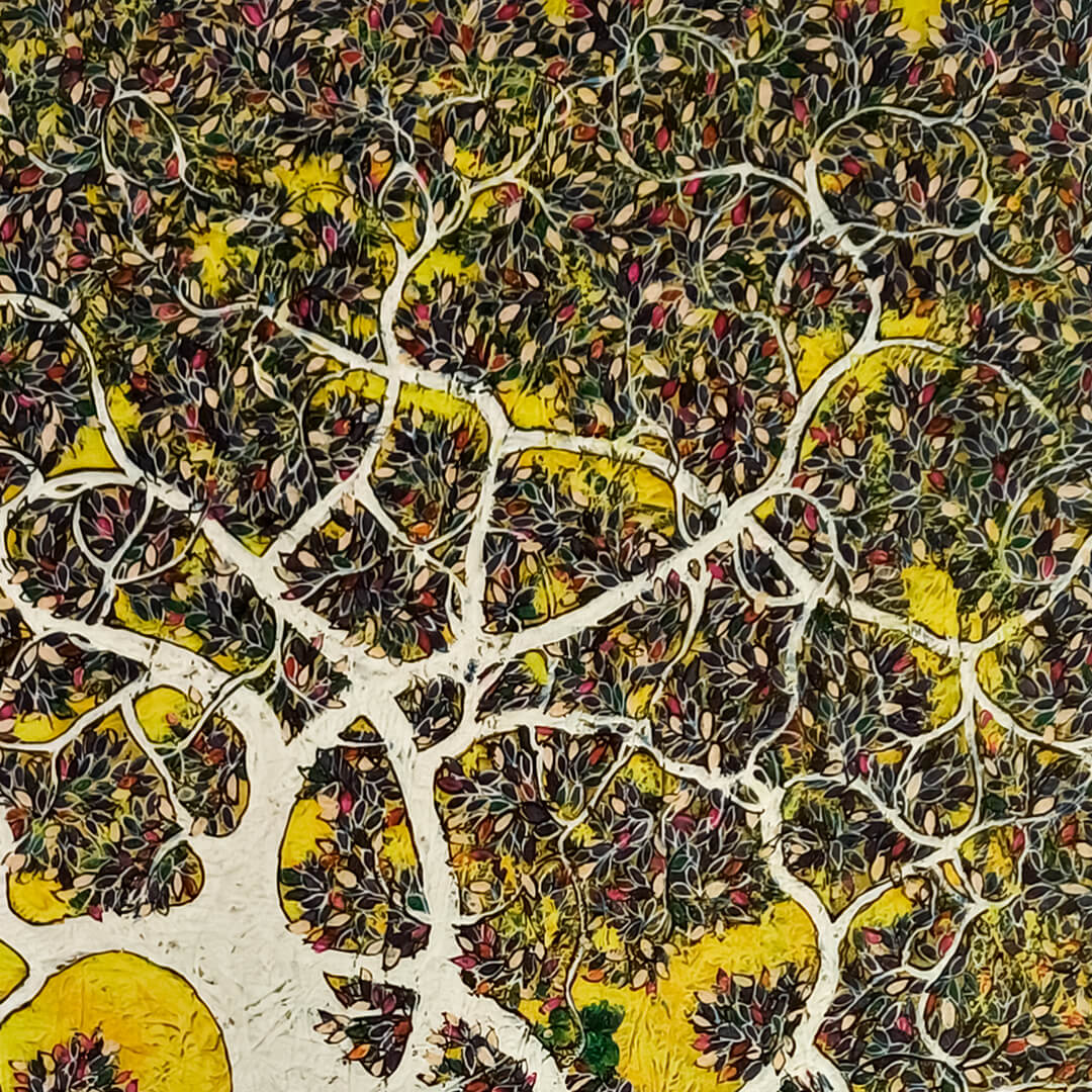 Bhaskar Rao Botcha’s experimentation with figurative and street art led him to natural landscapes, consequently developing his profound, sensory interest in trees – which were to become the core element of his works. ... His artworks, which feature countless trees, lush landscapes flecked with golds, pinks, blues and blacks, vast water bodies and rolling meadows, are meant, in his own words, “to reflect the memories and experiences I have collected from the places I have lived, touched, smelled, heard and walked through.” For Botcha, trees are culturally significant emblems, deeply embedded in Indian mythological narratives, as well as occupying sacred roles. Further, they assume important roles within the physical landscape, not only yielding fruits but providing shade, covering and protecting the earth’s surface. The artist, for whom trees are lifelike characters themselves, renders these trees in myriad mediums, returning each time to them with a new resplendent vision.
