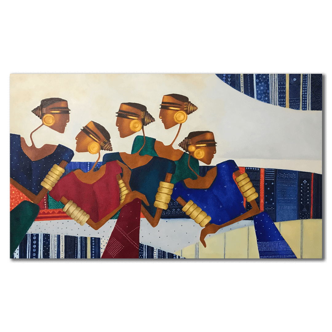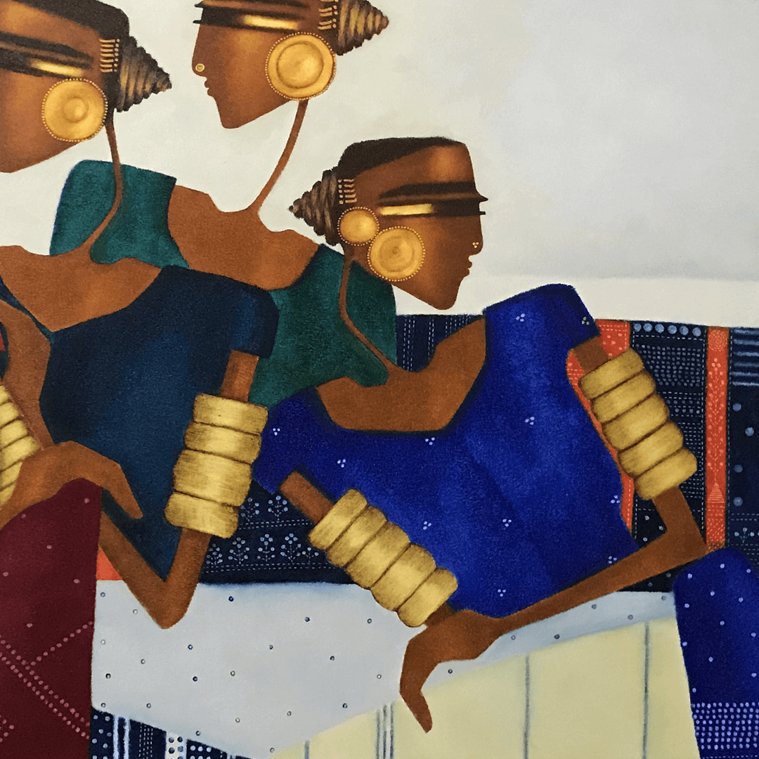 Bharti Prajapati’s work is a reimagining of Indian folk art, in which the characters are both fantastical and deeply familiar. Inspired by the five elements, and curious about how they interact so seamlessly in nature and within the human body, Prajapati paints with forms and colours that are innately elemental. Her colours are borrowed from the natural world--reds, ochres, earth tones and the sudden splash of indigo are expertly blended together in vivid detail. ... Within each painting, Prajapati moves from the intricate to the abstract, seeming to capture her subjects in a heightened state of movement. She supplies her characters with emotion, but their world is a wash of patterns and shadows. In essence, Prajapati reimagines the collage of elements around us as a vivid tableau of light and life. Prajapati has been invited to showcase her work at numerous Indian and international exhibitions, and is a recipient of the Bharat Kala Ratna Award.