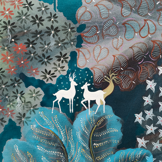Priyanka Aelay’s acrylic works unfold like magic realist tales filled with birds, beasts, animals, trees and flowers in bold, vibrant colours. Her mythical, enchanted forests are filled with intricate motifs, exquisite patterns and striking imagery. ... On her canvas, age-old folk heritage — particularly from Telangana, from where she hails — is transformed into something that is distinctly contemporary and wholly unique, as she seeks inspiration from the environment and indigenous flora and fauna. Aelay’s paintings reflect the energy, momentum and simplicity of folk art, as well as the aesthetics and language of contemporary art. Paintings do not follow a linear perspective in the artist’s work, as she plays with space, dimensions and perspective to make the landscapes appear free flowing and free floating. Aelay’s works are an invitation to transport and immerse yourself in the unboundedness of nature and the wilderness, something sorely lacking in our urban ecosystems.