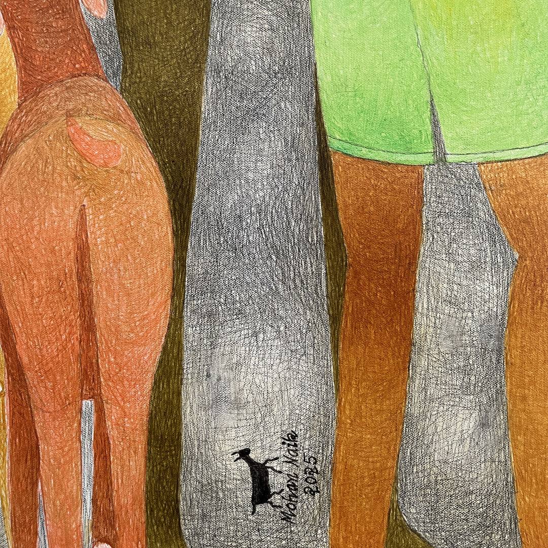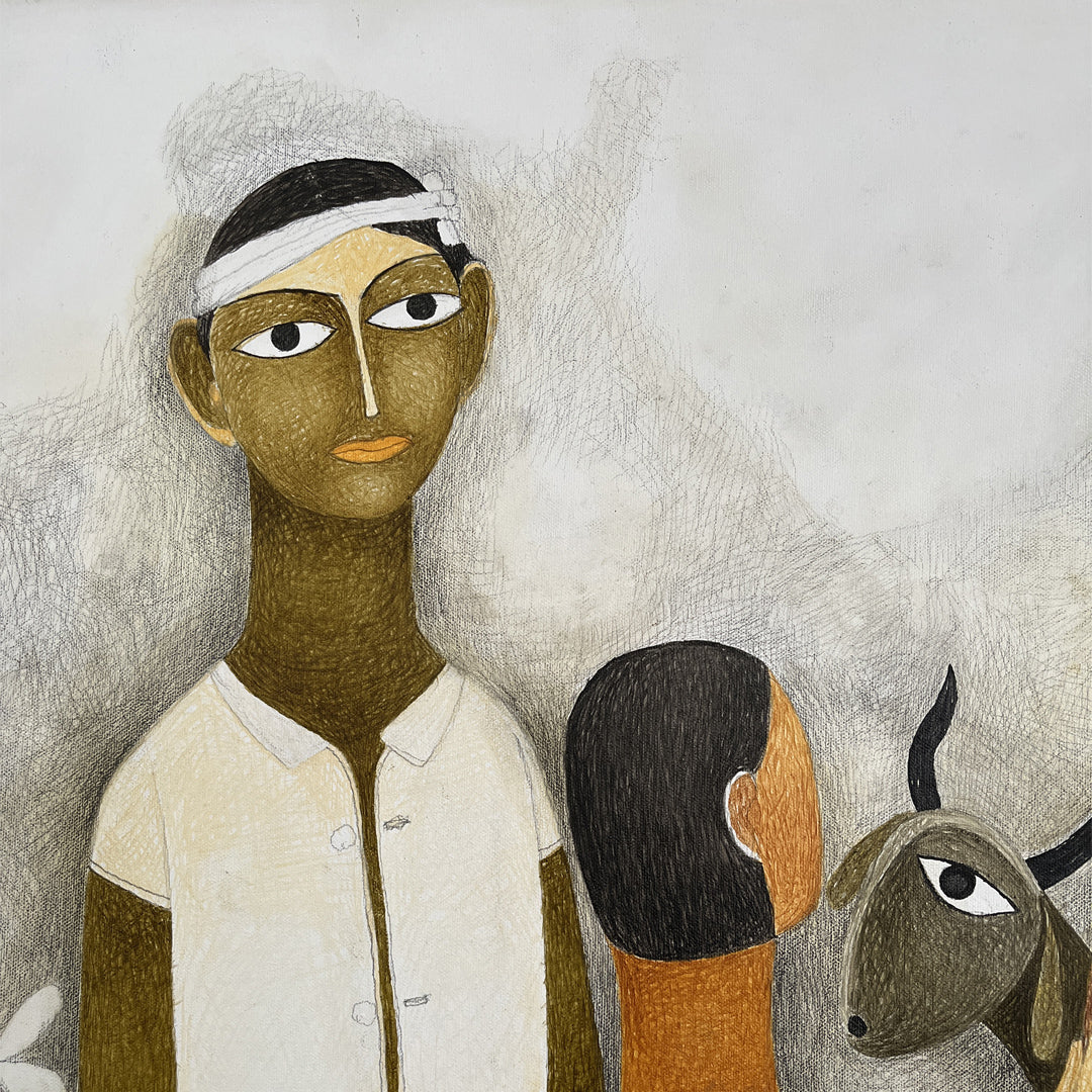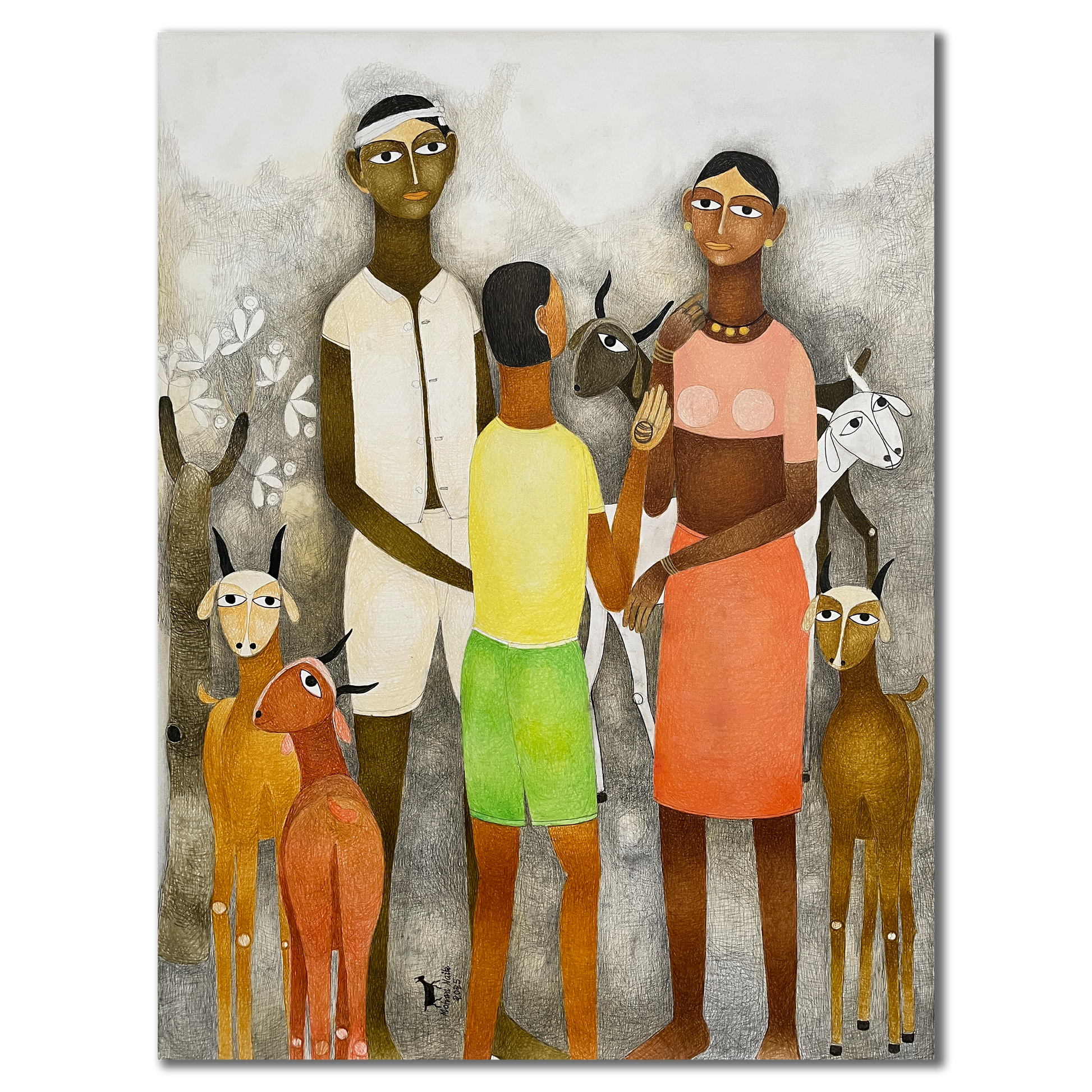 Mohan Naik’s art features a Goa, faraway from its tourist attractions and beaches. His luminous oils on canvas depict the simple and serene world of Goan villages. The artist, who lives in a secluded hamlet in South Goa, finds his muse in its pastoral life and pristine nature. ... Rustic scenes bathed in the soft glow of light and warm, incandescent colours, depict goatherds, farmers and fisherfolk, in everyday settings, going about their daily chores. The stylised figures, shown alongside animals and trees, exude a quiet radiance and a state of oneness with the natural world around them.