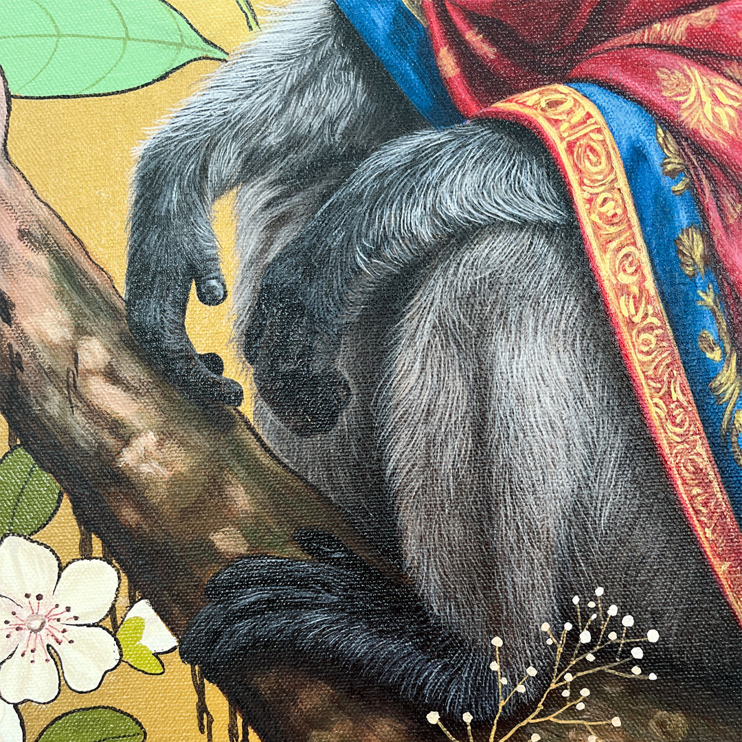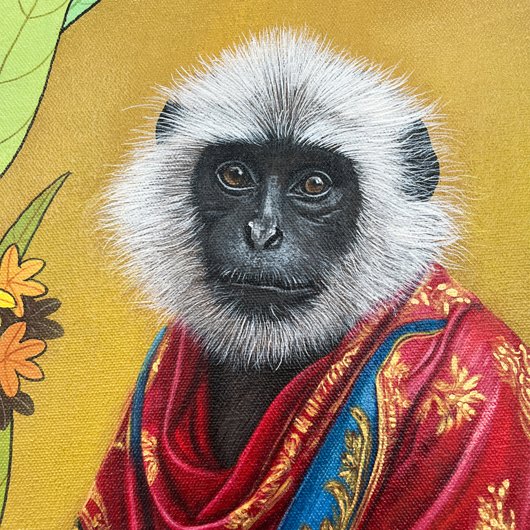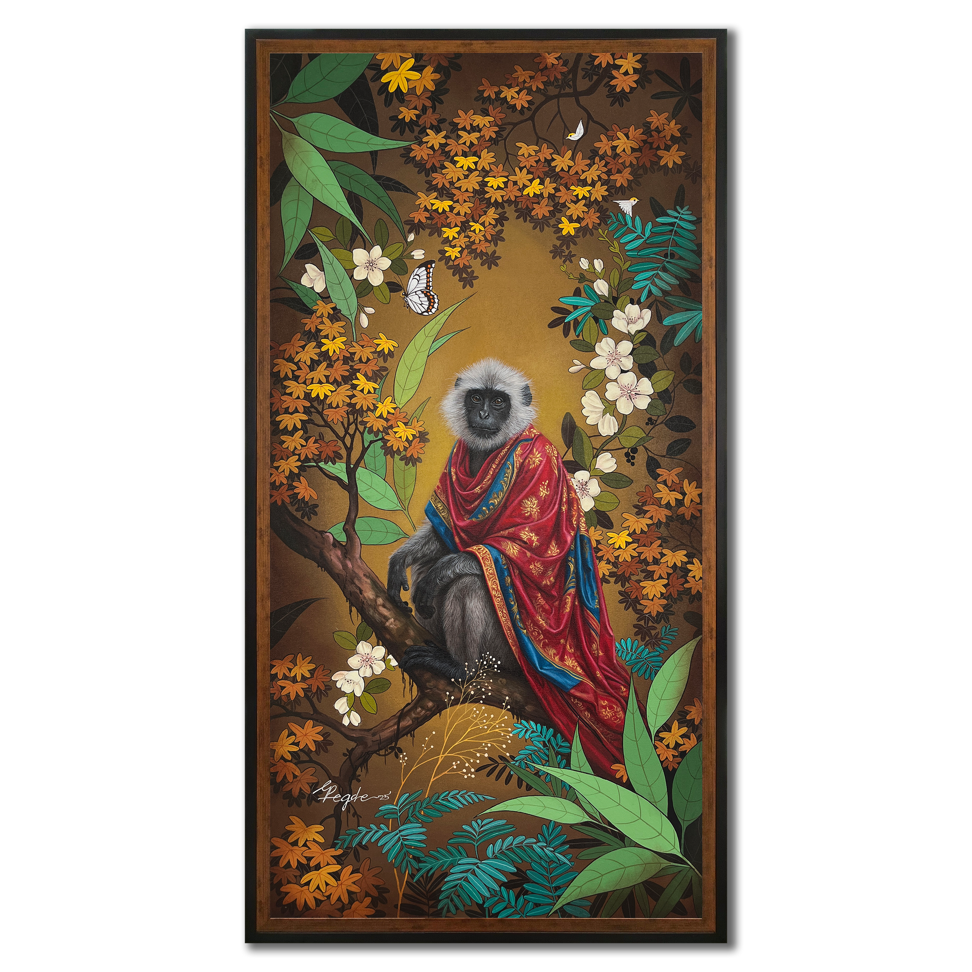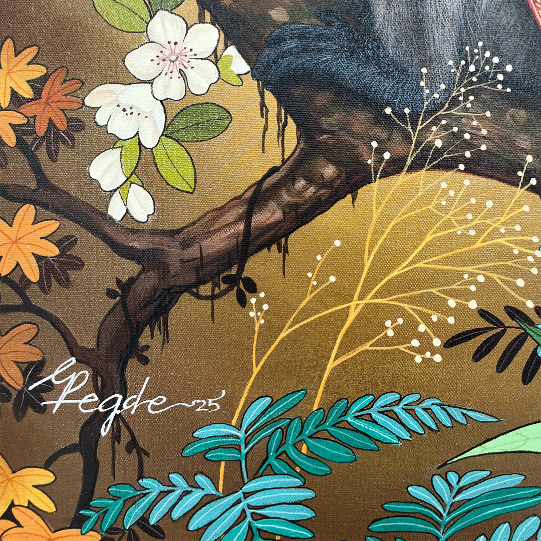 Ganapati Hegde paints half-real, half-imagined worlds, layered with fantastical and unexpected elements that depict the rapturously green and radiant landscape of North Karnataka’s coast where he grew up. ... Hegde’s otherworldly jungle is full of interesting minutiae, and is inhabited by nature’s assorted residents, from caterpillars and chameleons to monkeys and butterflies, alongside a profusion of foliage painted in bright blues, reds, greens and lavenders. Amidst the lushness of Hegde’s vibrant acrylic and oil canvases sit sly anthropomorphic animals and familiar urban objects, including laptops, flags and furniture. While nature and its furry, feathery, and floral protagonists remain centre stage, an undercurrent of fable-like storytelling and sharp wit ripples through his work, compelling viewers to dig beneath the thicket of indigenous plants, flowers, birds, animals and insects.