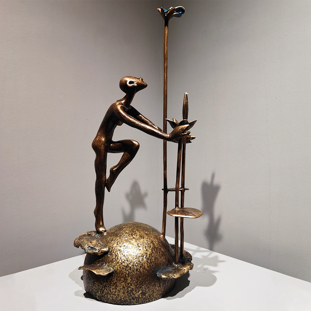 Dimpy Menon was the first Indian sculptor to win the Lorenzo il Magnifico Bronze Award at the Florence Biennale. Dimpy has been called a “Natural” by World Sculpturemagazine which said, “She captures the graceful, acrobatic movements of the human body with rare sensitivity.” Dimpy has had several exhibitions in India and abroad.... When the Oberoi Hotel in Mumbai re-opened its lobby after the terror attacks of 26/11 a prominent change was a bronze sculpture there by Dimpy. The seven-foot composition has been described as “stunning” by the travel guru Mary Gostelow. Dimpy’s works have been specially commissioned by some of the largest hotel chains and corporate houses, including The Oberoi, The Leela, The Marriott, The Holiday Inn, Crowne Plaza, TVS, Indo-Us Venture, General Electric, National Semiconductor, UKN, Total Environment, VR Bengaluru, World Trade Centre (Pune), The 42, Kolkata, Bengaluru International Exhibition Centre. The CNN International told its patrons, “Don't miss the sculptures by Dimpy Menon dotted around the premises at the Trident in Bandra-Kurla.” Open magazine pointed out that “Menon’s figures seem to defy the laws of physics… and yet, the muscled human bodies excite the viewers…”