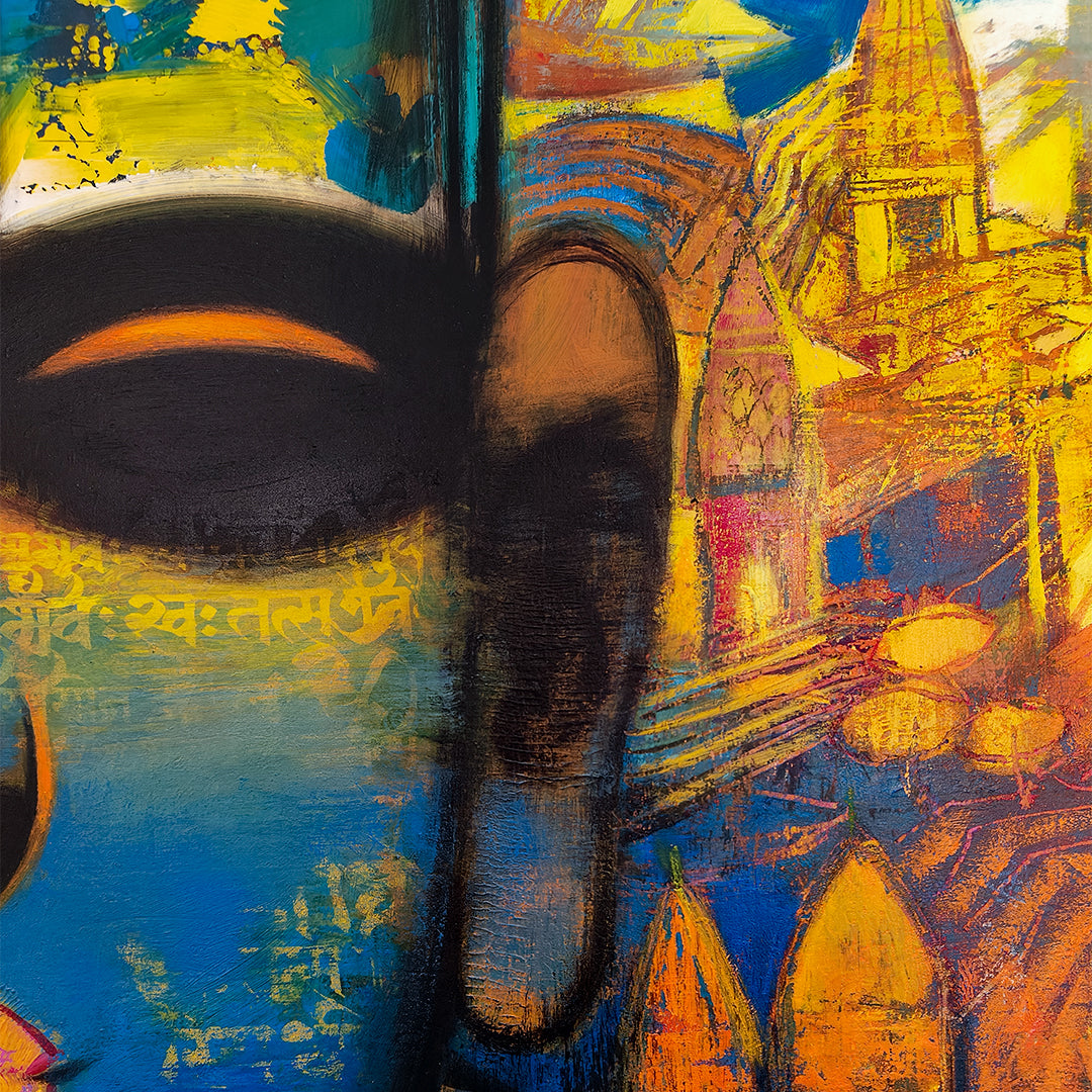 Sujata Achrekar is a Mumbai-based artist whose compelling canvasses reel you in with their hypnotic faces and magnetic colours. Predominantly worked in oils with a profusion of earthy tones like burnt sienna, ochre and rust orange, the canvases occasionally feature white for contrast. However, Achrekar is not averse to more brilliant hues, also using blues, reds and yellows sparingly in her palette. Combining figurative representation with abstract schemas, her works attempts to convey personal reflections. Focussed on a central figure, her canvases create a meditative, pensive and often melancholic mood.... Achrekar is particularly recognised for her Brahmin Brahmachari series, in which the figure of a Brahmin boy is foregrounded — tonsured-headed, traditionally attired and often quietly intense — superimposed upon Sanskrit verses and traditional manuscript imagery. Religion however, is not the subject of exploration in her works, which are far more focused on spirituality and the nature of seeking. She also uses various techniques like scratching, overlapping, scrubbing and rollers in order to add a unique textural quality to her canvases.