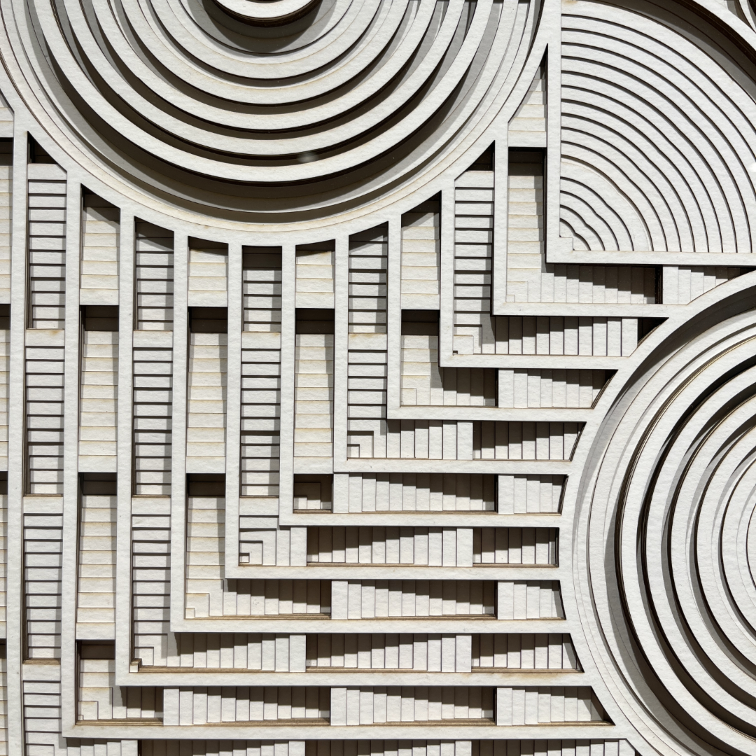 The interrelationship of space, line and volume form the core of Ravi Shankar’s ongoing body of work, titled the Construction Series. The lazer-cut paper relief works are objects of precision, presenting controlled contrasts of light and shadow, texture and flatness, as the artist plays with the rhythms and tensions caused by complex mathematical layering of the medium. Devoid of any distractions of colour, the structures form multiple patterns and tonal gradations through their dimensionality. These evoke ideas of architectural labyrinths, diagrams of sacred geometry or even topographies of imagined landscapes, as the eye is drawn inward and across the surfaces.