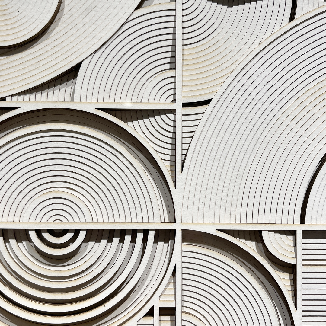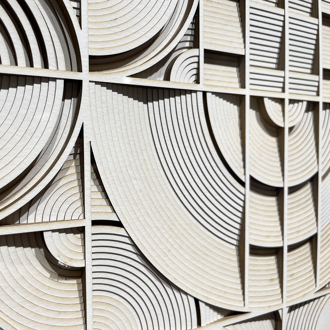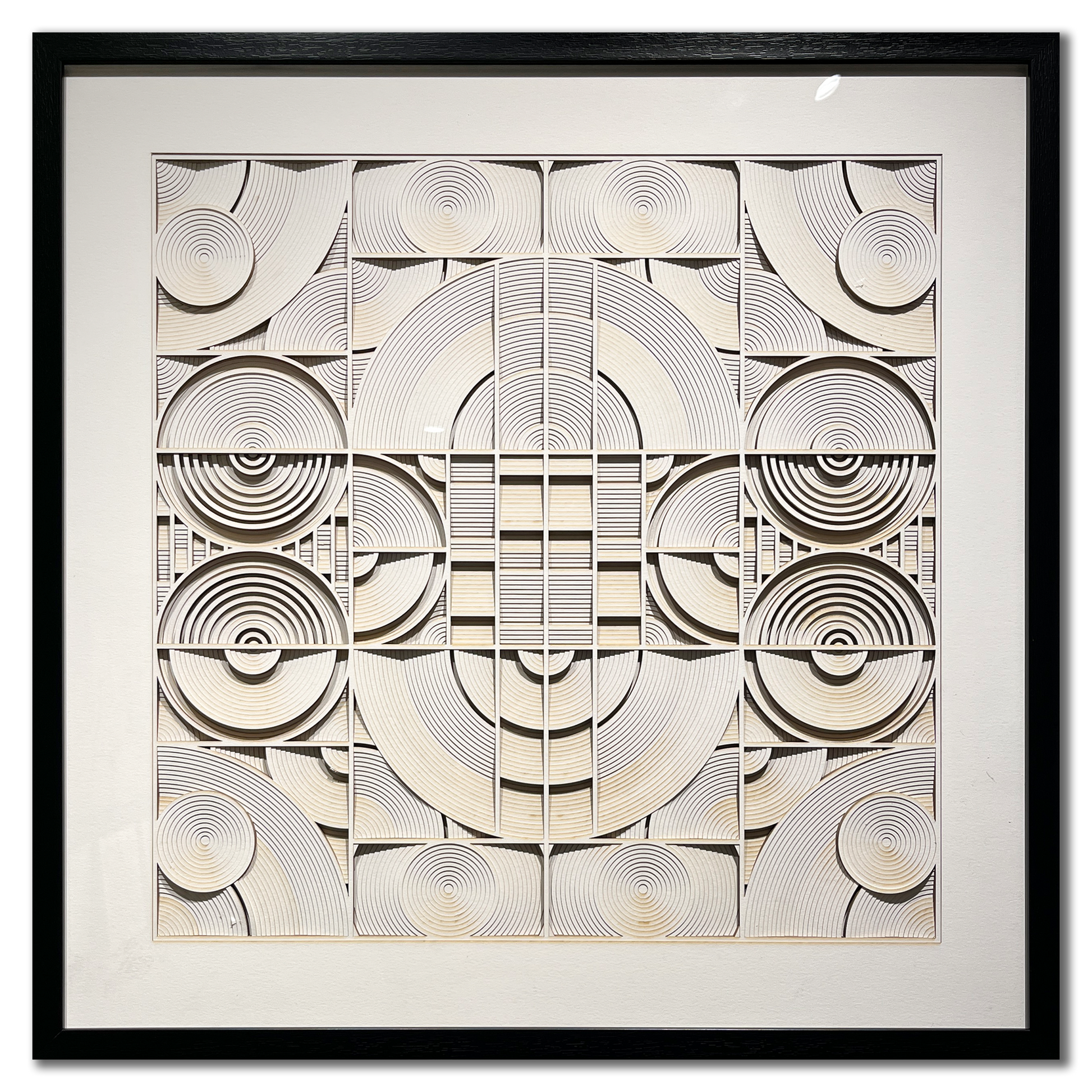 The interrelationship of space, line and volume form the core of Ravi Shankar’s ongoing body of work, titled the Construction Series. The lazer-cut paper relief works are objects of precision, presenting controlled contrasts of light and shadow, texture and flatness, as the artist plays with the rhythms and tensions caused by complex mathematical layering of the medium. Devoid of any distractions of colour, the structures form multiple patterns and tonal gradations through their dimensionality. These evoke ideas of architectural labyrinths, diagrams of sacred geometry or even topographies of imagined landscapes, as the eye is drawn inward and across the surfaces.