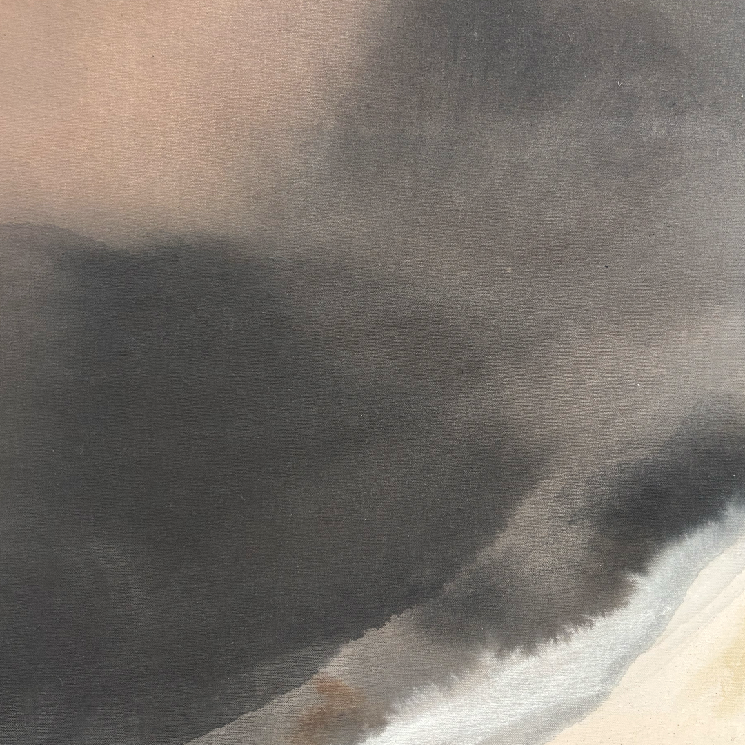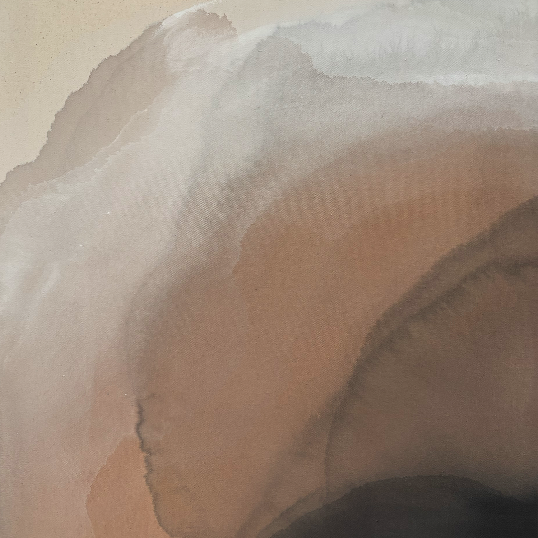Meghana’s artworks draw you into an abstract wilderness of colour, sensation, texture and light. Her abstract acrylics map luminous terrains that are a transportive meditative experience – a deep breath that evokes peace, calm, and solace. ... The organic, amorphous, muslin-thin mists and shapes that float across her expansive canvases are achieved by pouring watered-down paint onto the canvas, letting the paint take its own form. The artist then nudges the paint in different directions, repeating the process in layers to create enigmatic, intuitive pieces. On her process, she says, “After all – in life, we only have limited control. For the rest, we need to let things take its course.” Meghana’s earthy, ethereal palettes full of browns, blacks, white and blues resemble elemental natural forces, contributing to this sense of comfort, inner peace, and the idea of giving way, and letting the world take over.