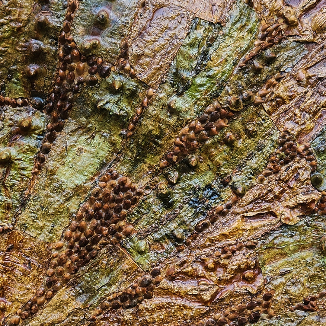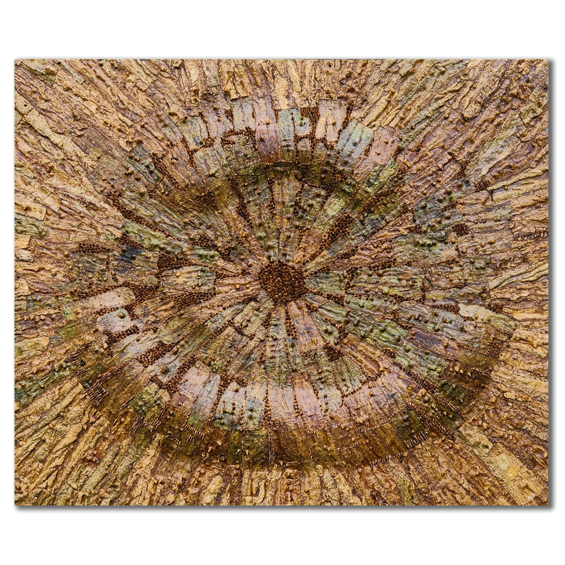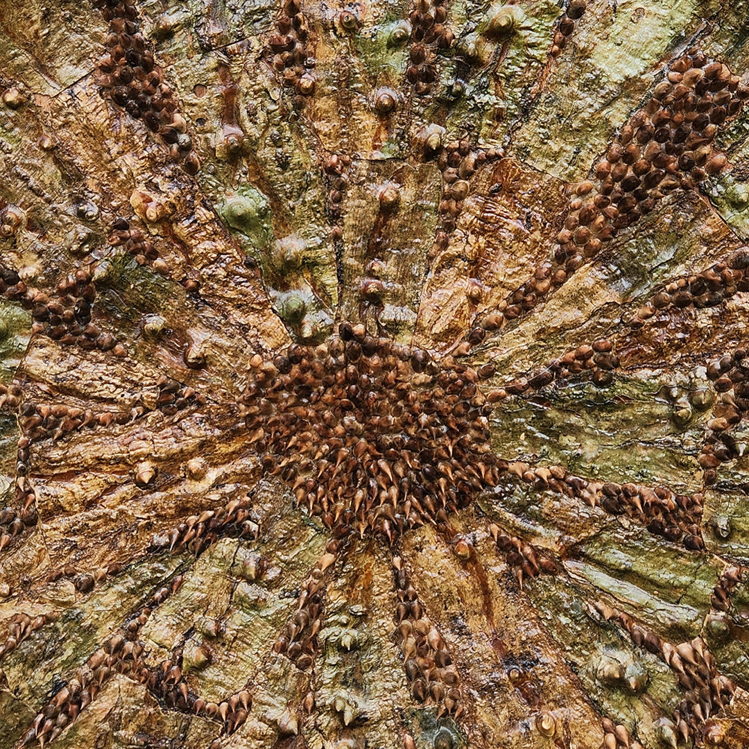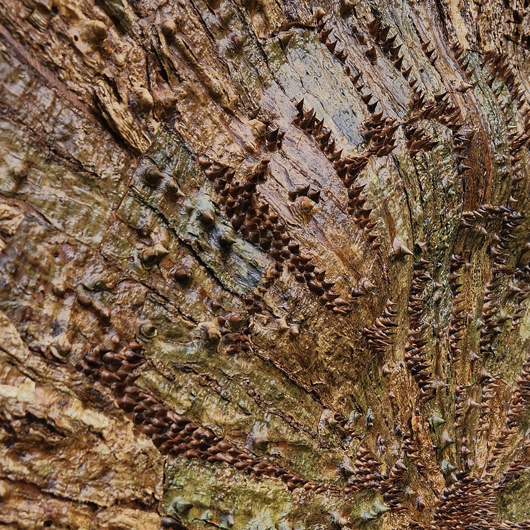 Each sculptural piece offers a meticulous arrangement of vegetal matter, shaped in patterns that play with symmetry and asymmetry, geometric and organic abstraction. In his works with tree-bark, Sandilya brings focus to the intrinsic botanical characteristics of various trees and the textures, colours and type of surfaces that often go unnoticed in the blur of urban living. His other artworks become experimental spaces that explore dimensional formations of twigs, thorns, seeds, dried vines and other natural material that he collects.