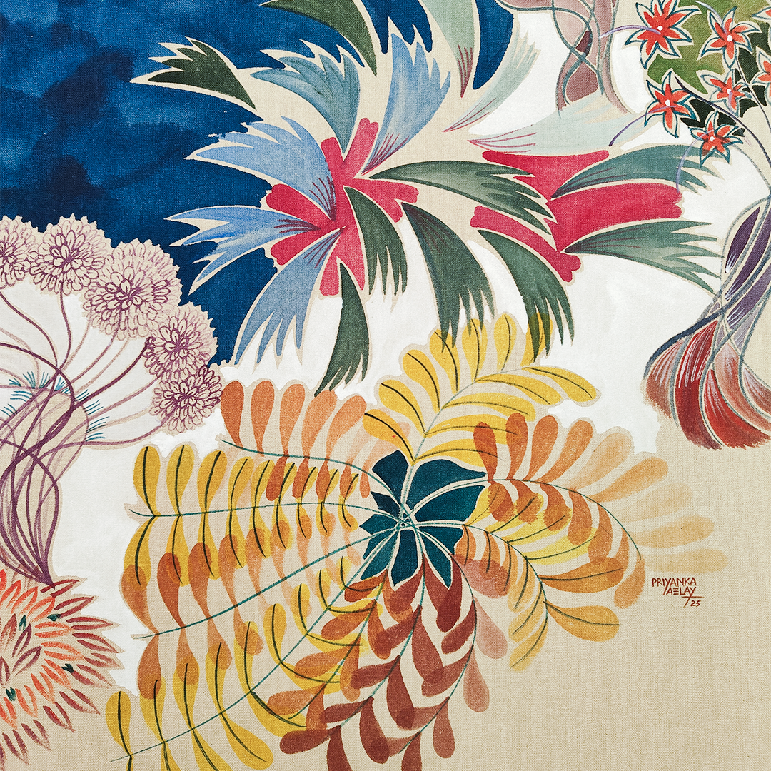 Priyanka Aelay’s acrylic works unfold like magic realist tales filled with birds, beasts, animals, trees and flowers in bold, vibrant colours. Her mythical, enchanted forests are filled with intricate motifs, exquisite patterns and striking imagery. ... On her canvas, age-old folk heritage — particularly from Telangana, from where she hails — is transformed into something that is distinctly contemporary and wholly unique, as she seeks inspiration from the environment and indigenous flora and fauna. Aelay’s paintings reflect the energy, momentum and simplicity of folk art, as well as the aesthetics and language of contemporary art. Paintings do not follow a linear perspective in the artist’s work, as she plays with space, dimensions and perspective to make the landscapes appear free flowing and free floating. Aelay’s works are an invitation to transport and immerse yourself in the unboundedness of nature and the wilderness, something sorely lacking in our urban ecosystems.