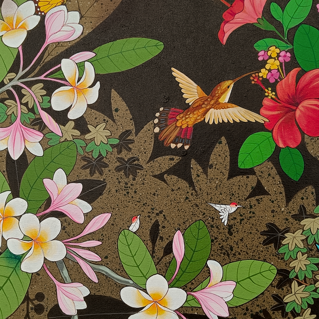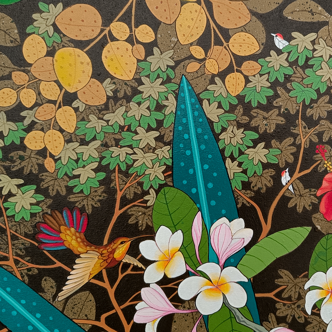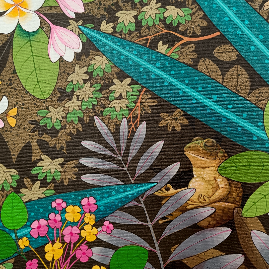 Ganapati Hegde paints half-real, half-imagined worlds, layered with fantastical and unexpected elements that depict the rapturously green and radiant landscape of North Karnataka’s coast where he grew up. ... Hegde’s otherworldly jungle is full of interesting minutiae, and is inhabited by nature’s assorted residents, from caterpillars and chameleons to monkeys and butterflies, alongside a profusion of foliage painted in bright blues, reds, greens and lavenders. Amidst the lushness of Hegde’s vibrant acrylic and oil canvases sit sly anthropomorphic animals and familiar urban objects, including laptops, flags and furniture. While nature and its furry, feathery, and floral protagonists remain centre stage, an undercurrent of fable-like storytelling and sharp wit ripples through his work, compelling viewers to dig beneath the thicket of indigenous plants, flowers, birds, animals and insects.