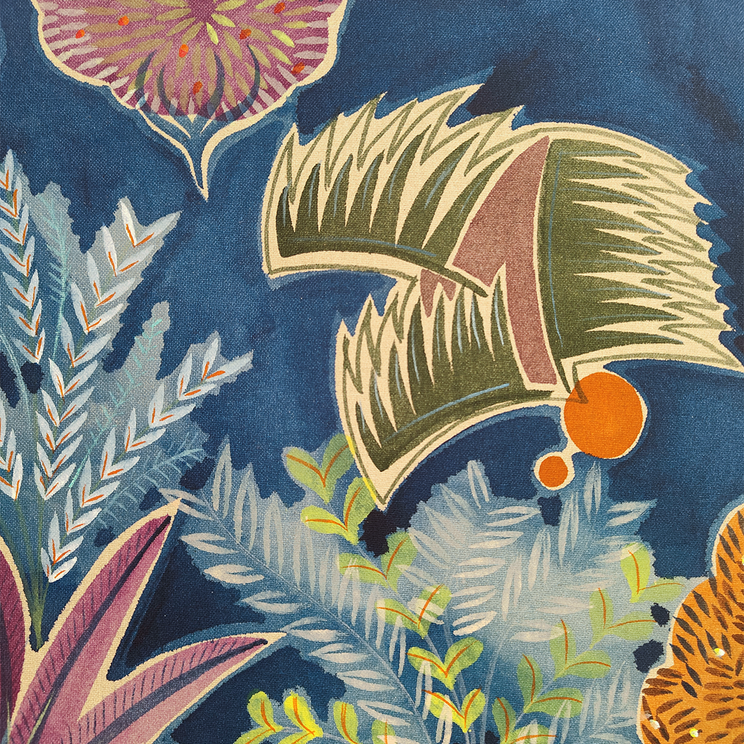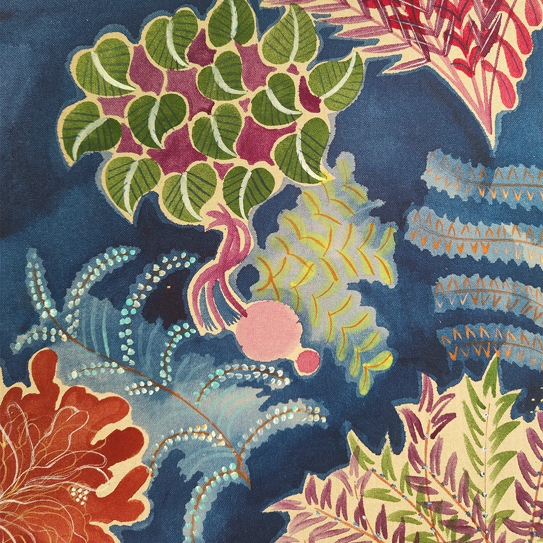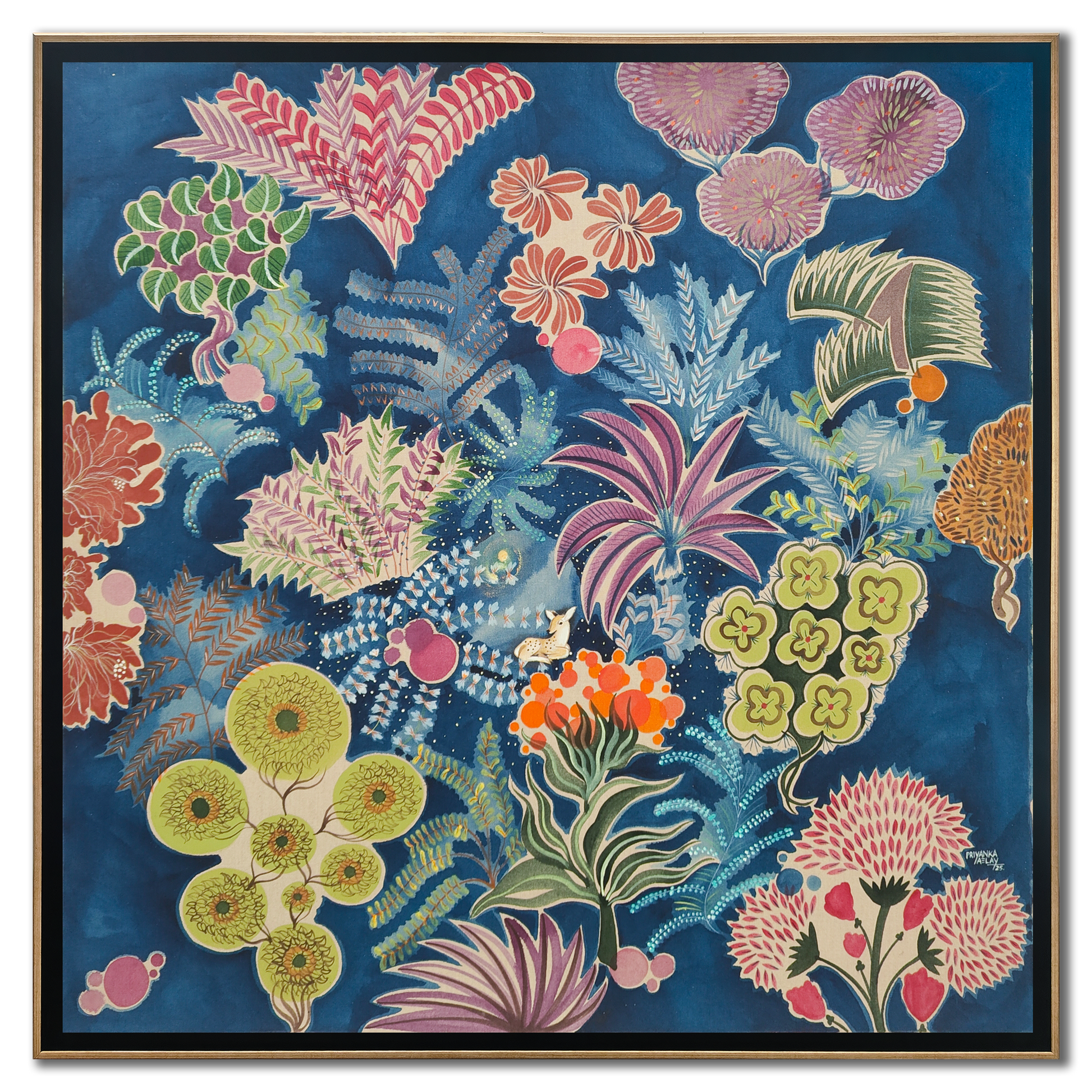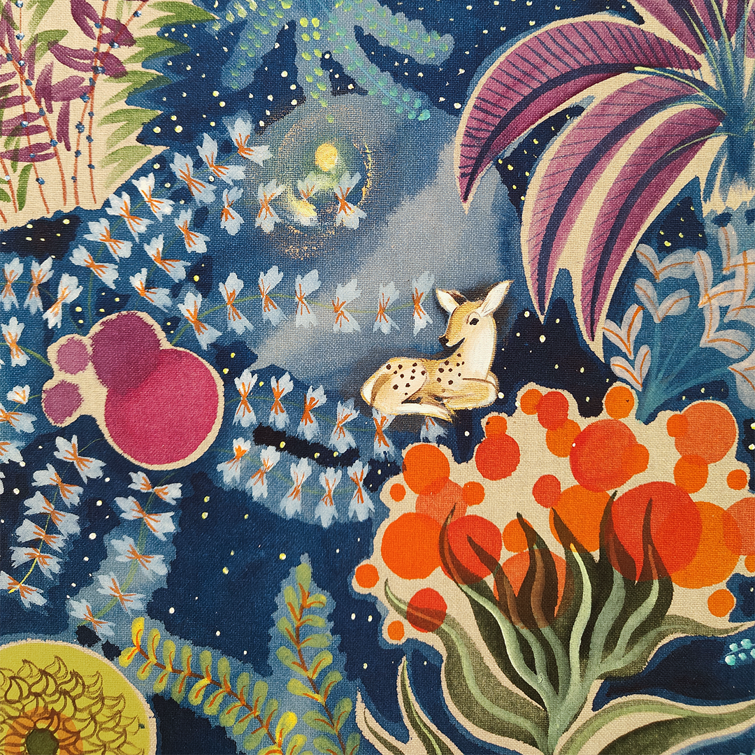 Priyanka Aelay’s acrylic works unfold like magic realist tales filled with birds, beasts, animals, trees and flowers in bold, vibrant colours. Her mythical, enchanted forests are filled with intricate motifs, exquisite patterns and striking imagery. ... On her canvas, age-old folk heritage — particularly from Telangana, from where she hails — is transformed into something that is distinctly contemporary and wholly unique, as she seeks inspiration from the environment and indigenous flora and fauna. Aelay’s paintings reflect the energy, momentum and simplicity of folk art, as well as the aesthetics and language of contemporary art. Paintings do not follow a linear perspective in the artist’s work, as she plays with space, dimensions and perspective to make the landscapes appear free flowing and free floating. Aelay’s works are an invitation to transport and immerse yourself in the unboundedness of nature and the wilderness, something sorely lacking in our urban ecosystems.