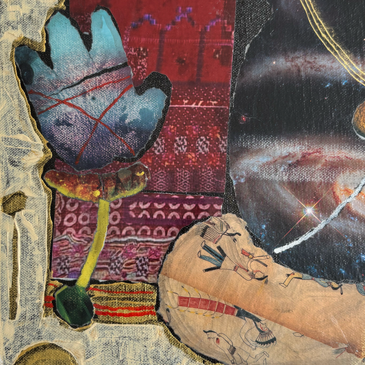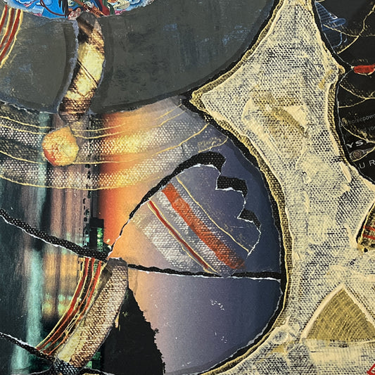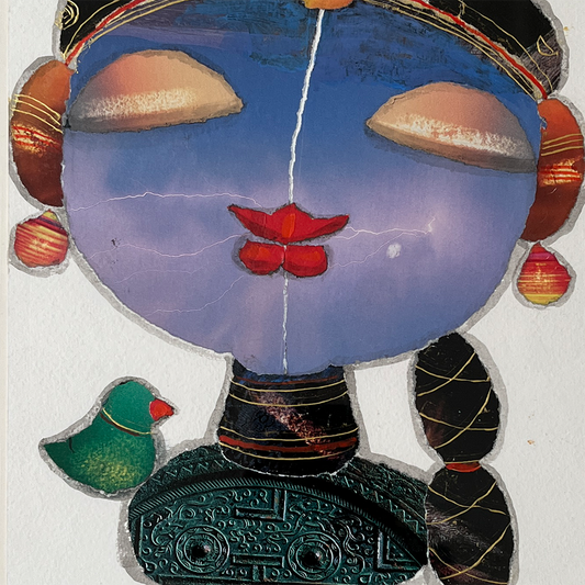 G Subramanian grew up in a village in coastal Tamil Nadu amidst folk performers and theatre troupes. His father was a stage artist, and this early exposure to make-up, costumes, screens and props shaped his unique, dramatic aesthetic vision. ... Fondly known as ‘Subra’, he is famed for his mixed-media works in which he uses the medium of collage, deftly layering them with acrylic paints and ink washes in brilliant hues to create distinctively striking artworks. Each work is brimming with purposeful textures, such that the viewer would “not only understand the emotion behind it, but … also feel it.” Steeped in symbolism and spiritual text, the subject of these boldly coloured works are often the gods and demigods of Hindu mythology, recast as playful, free-spirited and childlike beings. Subra teases viewers to look beyond the playful charm of his works towards deeper emotional and formal engagements.