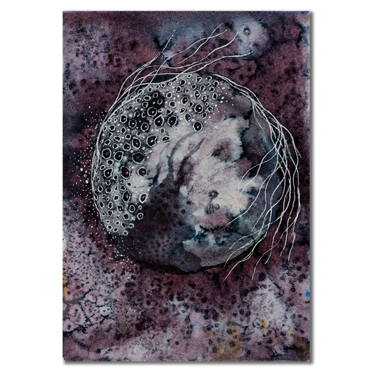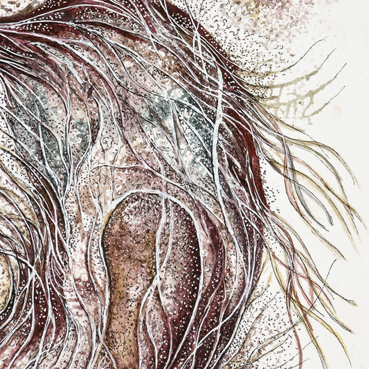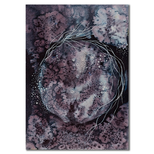 She paints forms that are dynamic, alive; whether isolated within empty space, or a part of meticulous configurations, they seem to flow and ebb, intrinsic to the nature of water-colours and inks they are created with. Tendrils sway in fictional tides, surrounded by speckles, dots and lines, textures and tinted washes, in a distinctly earthy colour palette, echoing the organic and cyclical nature of growth. Layering is also deeply embedded within her process, whether it is mark-making in pen and graphite, or developing varied surfaces through added pigments, chemical effects and even collage. In her most recent collaboration (‘Lush’, with Nikhil Narendra and Emilia Trevisani), she has also experimented with the layering of other media, creating an overlap between animated drawings and recorded sounds emanating within water bodies and other forms. .