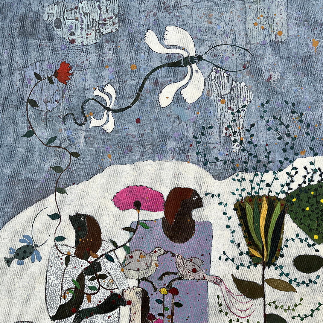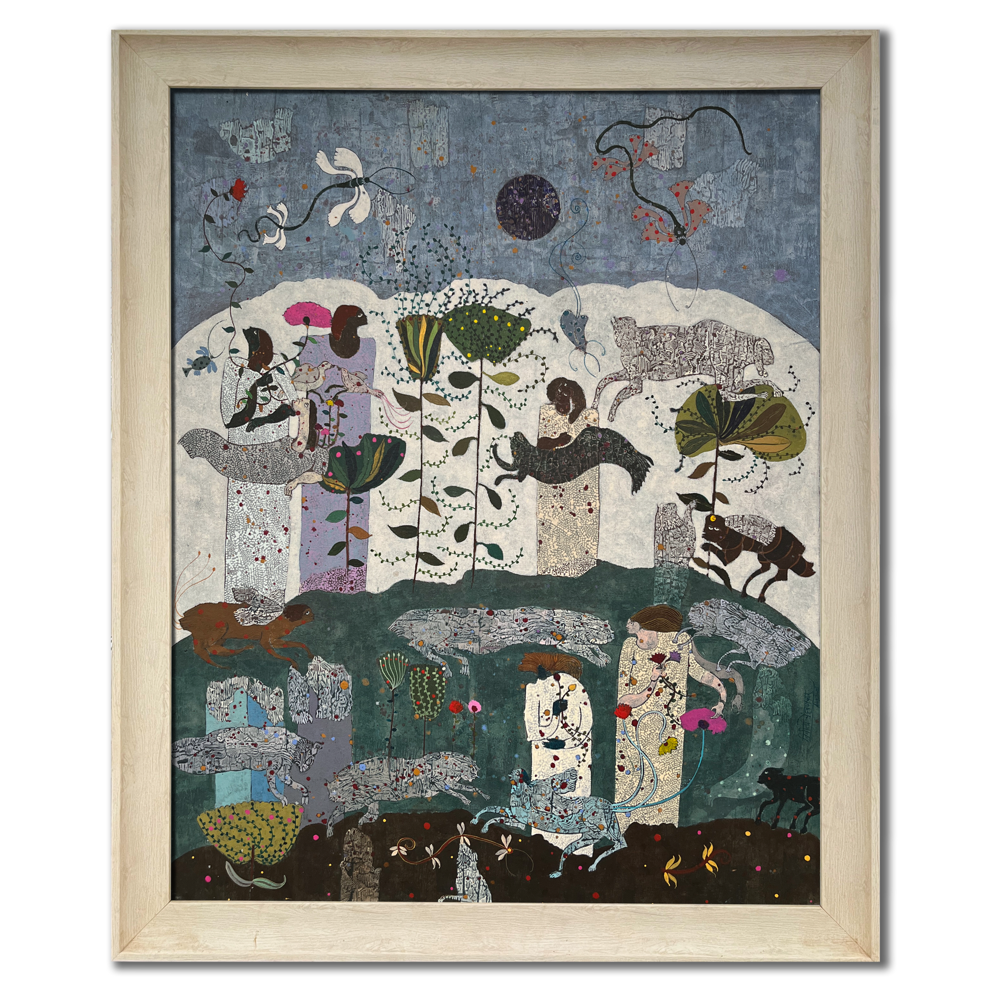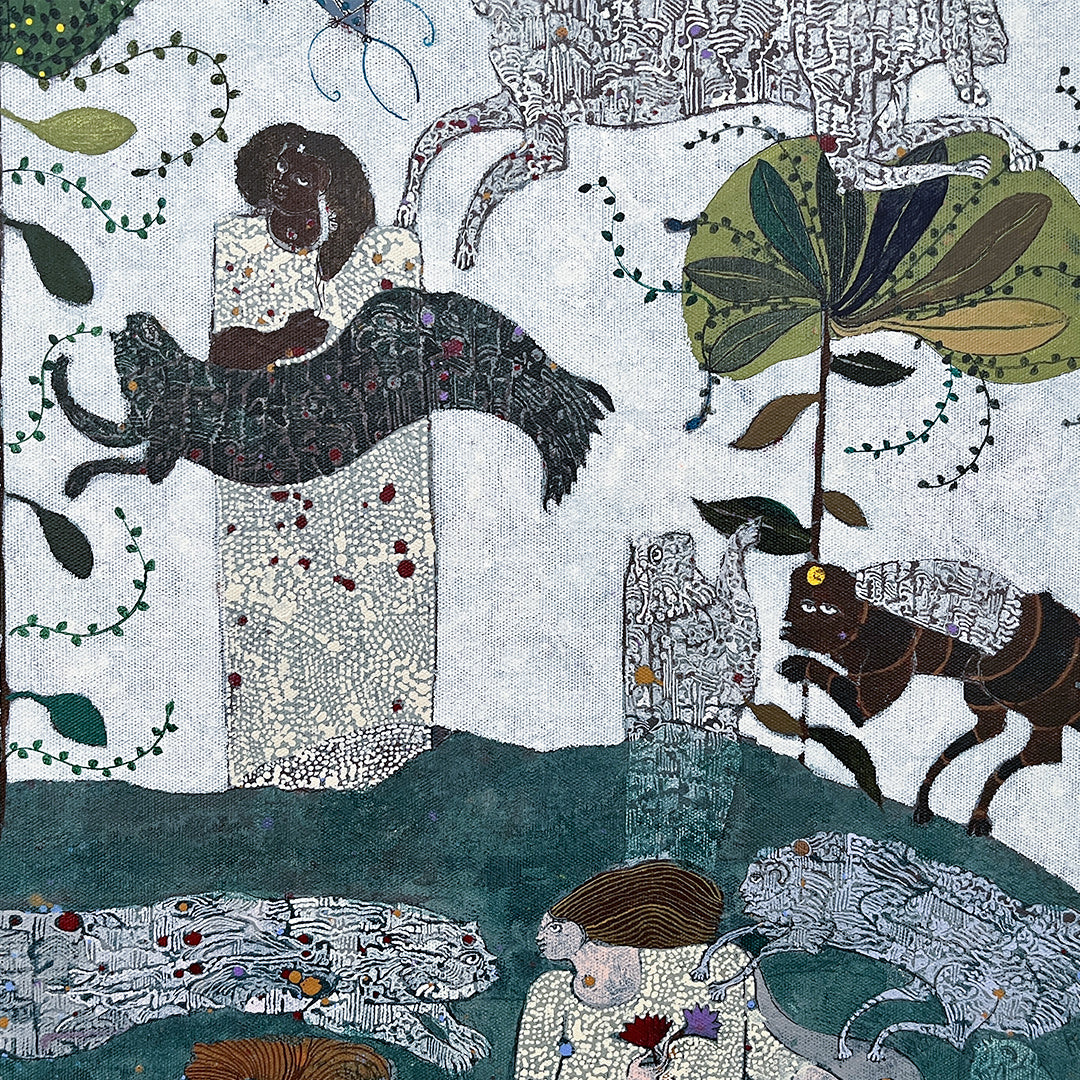 Describing her work, she says ‘’I confess to be a dreamer, and my works are the ethereal manifestation of these nocturnal journeys - a delicate collage of memories and fantasies”. Poetically connecting with forms that emerge from her sub-conscious, Veenita sees humanity as inseparable from nature, as she populates a world full of whimsical figures and benign creatures. Mythological tales that are naturally attuned to magical happenings and otherworldly attributes match perfectly with her visual vocabulary that celebrates acceptance and love.