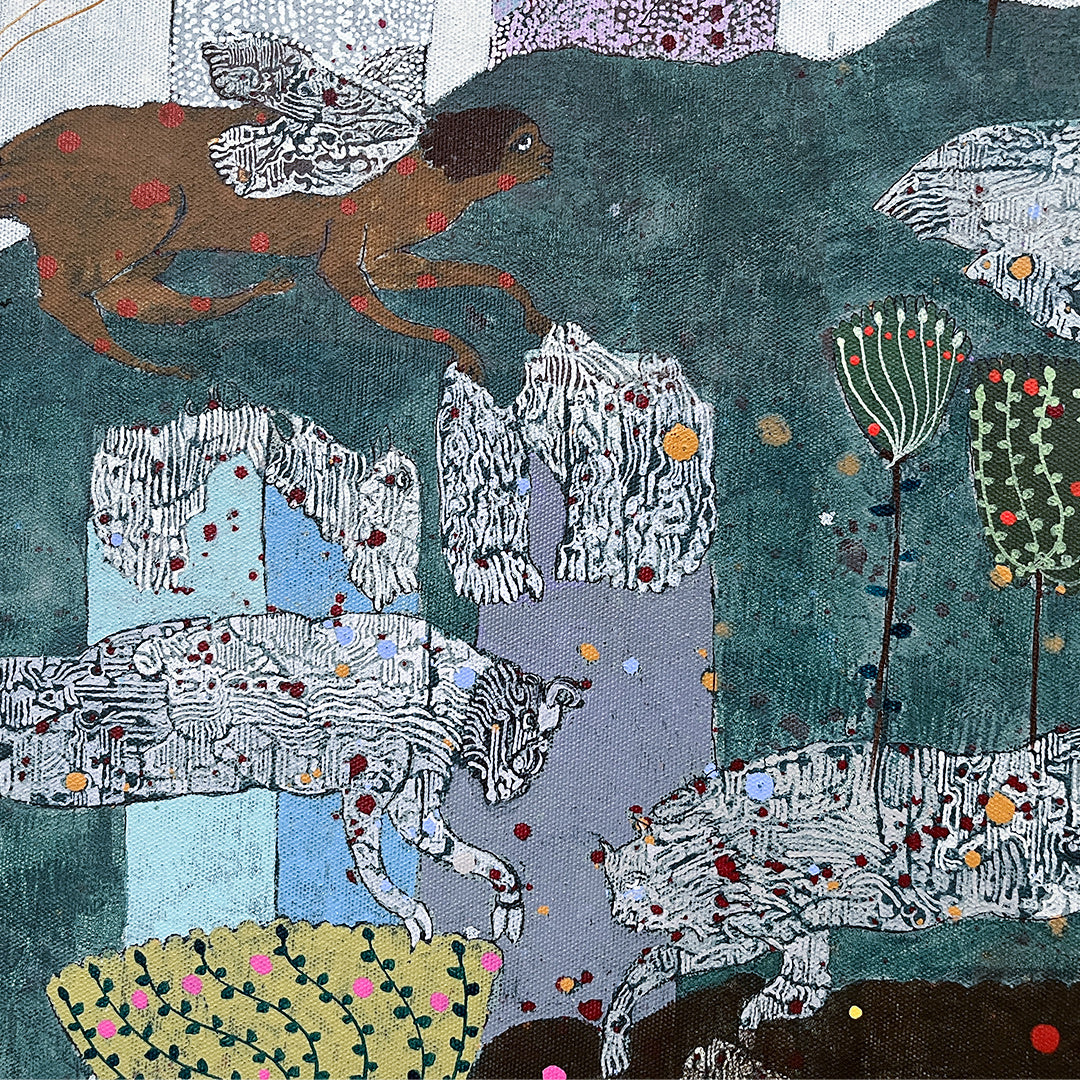 ...With a degree in fine art specialising in mural design, Veenita’s artistic techniques also blossomed under the guidance of her artist father Sadguru Chendvankar, an ex-Professor of art. An expert at tonal variations and colour theory, his presence expanded her learnings, as well as her focus on building an individualistic expression. Veenita’s practice revolves around experimentation with colour, particularly the unexpected and unusual shades that arise from tertiary mixes. She often makes annotations of colour-recipes, that she refers to and reuses very much like scientific formulae. The backgrounds she builds in her paintings are made up of coatings of acrylic pigments, applied deftly with rollers to create richly textured fields. Similar to the experience of pareidolia, Veenita sees and recognises varied forms within these layers, and builds them into complex narrative compositions. She plays with further layering and organic divisions in order to reveal and conceal, unify and separate forms, adding to the effect of floating figures in dream-like landscapes.