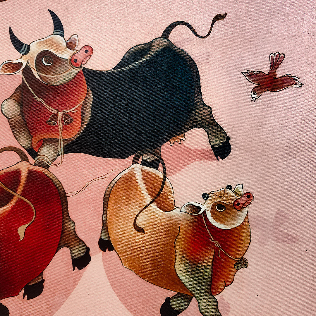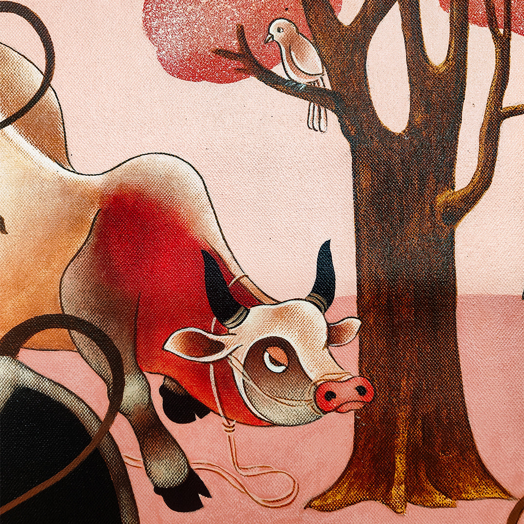 H.R. Das’s signature bulls and cows capture the essence of rural life. His portrayal of these beautiful beasts against an abstract background highlights their sheer magnificence and deep-rooted cultural significance.... HR Das’s kinetic art features unusual protagonists – sacred cows and bulls. Revered in Hindu mythology and an intrinsic part of rural life, cows and bulls frolic, wander and bask through the West Bengal artist’s acrylics-on-canvas. His bovine art captures the many moods, quirks and expressions of these beautiful creatures, ranging from powerful and vital to playful and endearing.