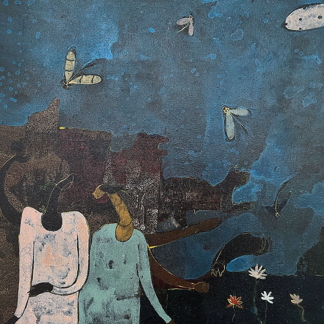 ...With a degree in fine art specialising in mural design, Veenita’s artistic techniques also blossomed under the guidance of her artist father Sadguru Chendvankar, an ex-Professor of art. An expert at tonal variations and colour theory, his presence expanded her learnings, as well as her focus on building an individualistic expression. Veenita’s practice revolves around experimentation with colour, particularly the unexpected and unusual shades that arise from tertiary mixes. She often makes annotations of colour-recipes, that she refers to and reuses very much like scientific formulae. The backgrounds she builds in her paintings are made up of coatings of acrylic pigments, applied deftly with rollers to create richly textured fields. Similar to the experience of pareidolia, Veenita sees and recognises varied forms within these layers, and builds them into complex narrative compositions. She plays with further layering and organic divisions in order to reveal and conceal, unify and separate forms, adding to the effect of floating figures in dream-like landscapes.