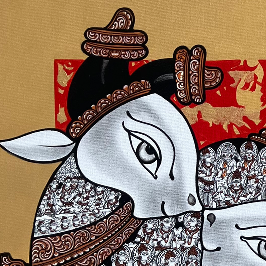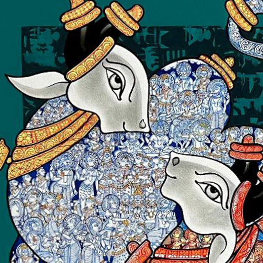 Vivek Kumavat’s primary muse is the majestic Indian bull. Kumavat sees bulls as a symbol of strength, and is especially inspired by their presence in Hindu mythology. His acrylic on canvas works see the bulls magnificently ornamented with a patchwork, inspired by the style of Indian miniatures.... Kumavat’s paintings are crafted in a series of layers, starting with a minimal, monochrome backdrop, often in red, orange or ochre. In the foreground, he composes the folk-like, artistically contoured form of the bull, which then serves as a canvas for a minutely intricate and wildly colourful depiction of scenes from Hindu mythology. Hindu gods and goddesses feature prominently and in vivid detail, offering a wealth of depth to Kumavat’s work that is especially captivating to the gaze. Kumavat has exhibited his work in numerous solo and group exhibitions in India, as well as in Singapore and the UK.