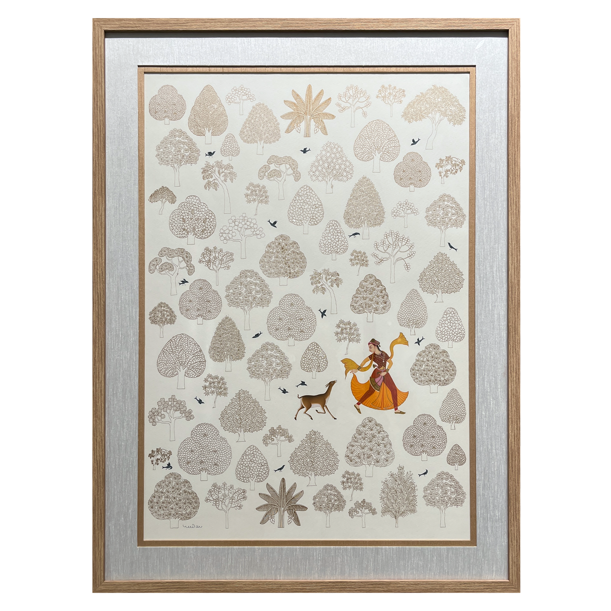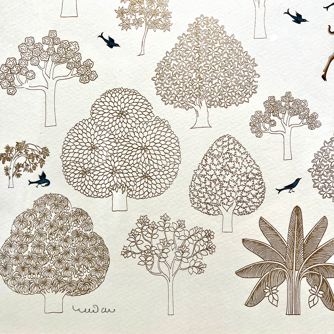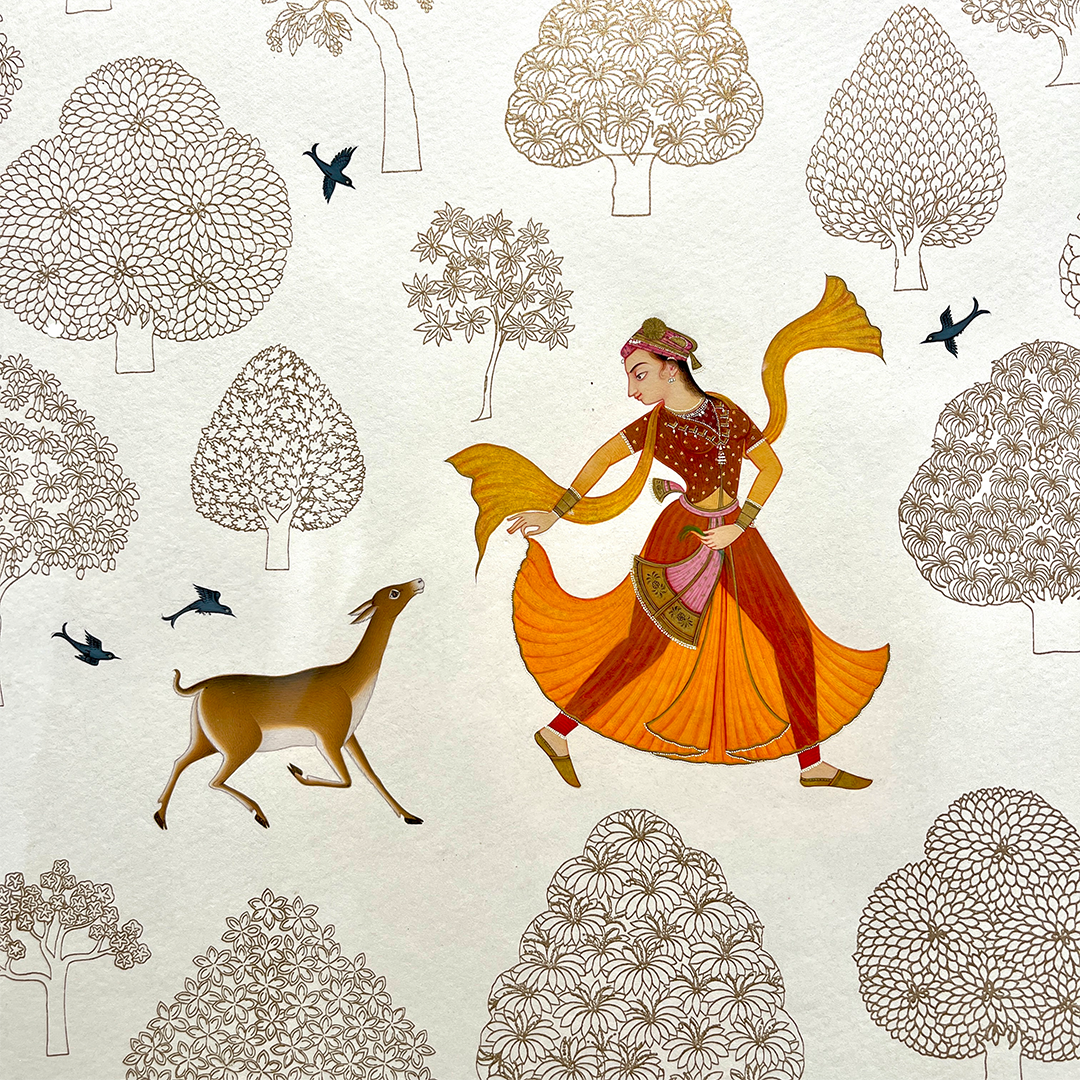 Madan Meena works extensively with rural, nomadic and tribal communities of his native Rajasthan. Through their last living practitioners, he delves into the state’s oldest folk traditions, documenting their lives in a bid to preserve their identities. ... As a practitioner, Meena revisits the languishing craft traditions of his birthplace, not only studying them as an academic, but reviving them as an artist. The classic Nayak and Nayika in his works are reimagined through a contemporary lens--the Barahmsa series is an expression of their emotions, told through the motifs of animals, while the Selfie series puts them in the centre of changing social milieu. In his preservation of lost or extinct artistic practices, he adds a contemporary flourish, as in his work drawn from the Kota and Bundi styles of miniature painting, in collaboration with local miniature artists. An artist and researcher, his doctoral thesis, “Art of the Meena Tribe,” which focused on the traditions of his own ancestral community, was accompanied by an exhibition of wall paintings by the women of the tribe. A recurring theme throughout his work is nostalgia, and the nomadic traveller’s longing for his homeland.