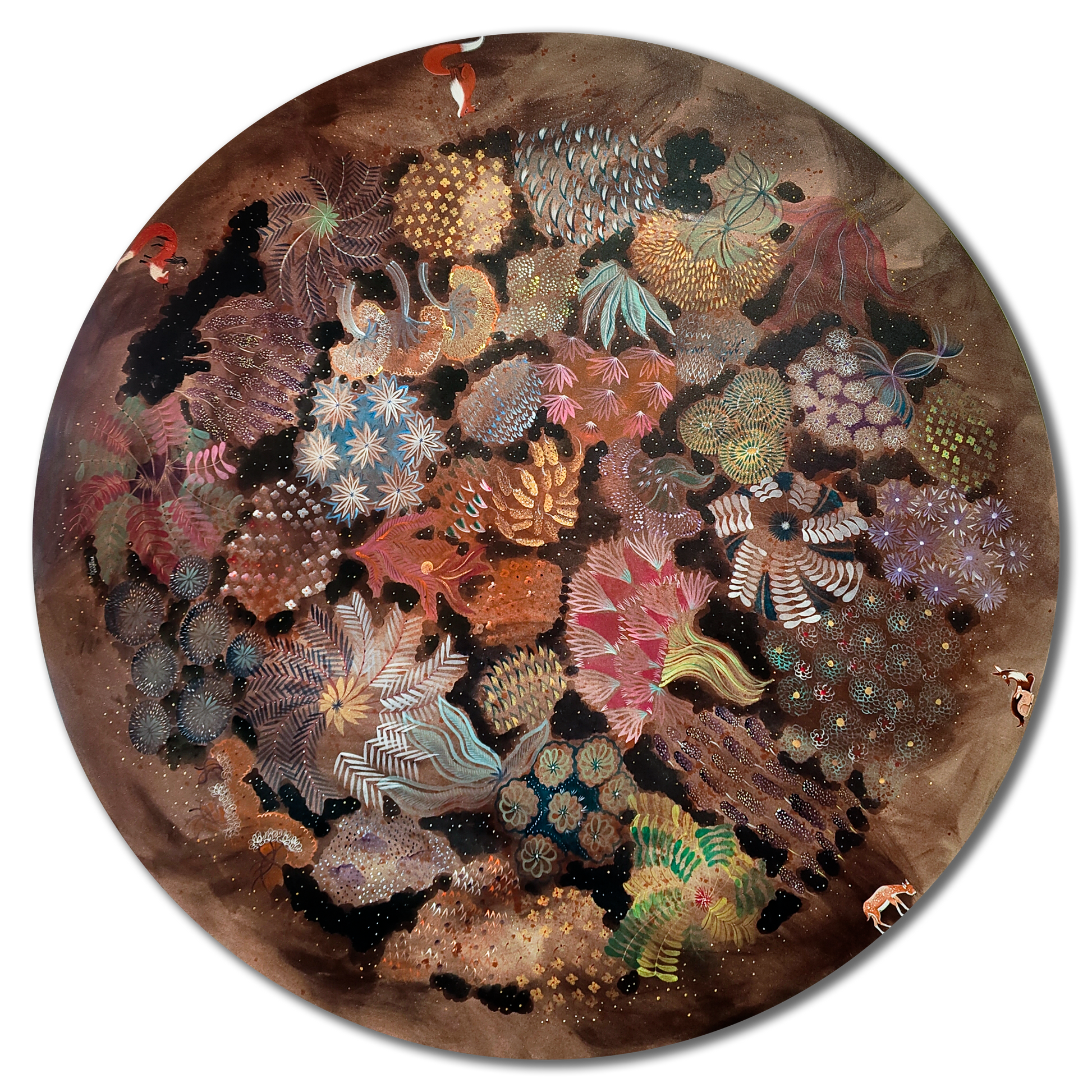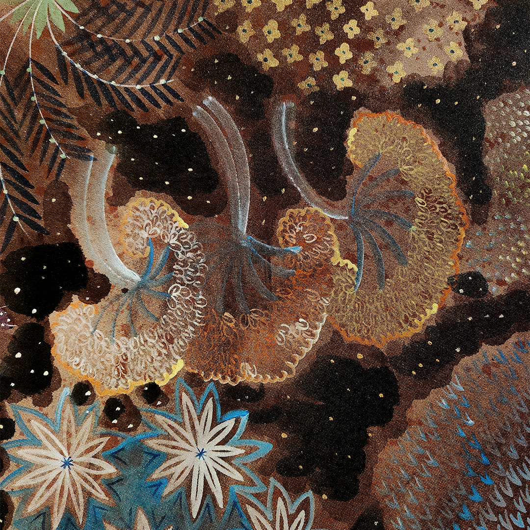 Priyanka Aelay’s acrylic works unfold like magic realist tales filled with birds, beasts, animals, trees and flowers in bold, vibrant colours. Her mythical, enchanted forests are filled with intricate motifs, exquisite patterns and striking imagery. ... On her canvas, age-old folk heritage — particularly from Telangana, from where she hails — is transformed into something that is distinctly contemporary and wholly unique, as she seeks inspiration from the environment and indigenous flora and fauna. Aelay’s paintings reflect the energy, momentum and simplicity of folk art, as well as the aesthetics and language of contemporary art. Paintings do not follow a linear perspective in the artist’s work, as she plays with space, dimensions and perspective to make the landscapes appear free flowing and free floating. Aelay’s works are an invitation to transport and immerse yourself in the unboundedness of nature and the wilderness, something sorely lacking in our urban ecosystems.