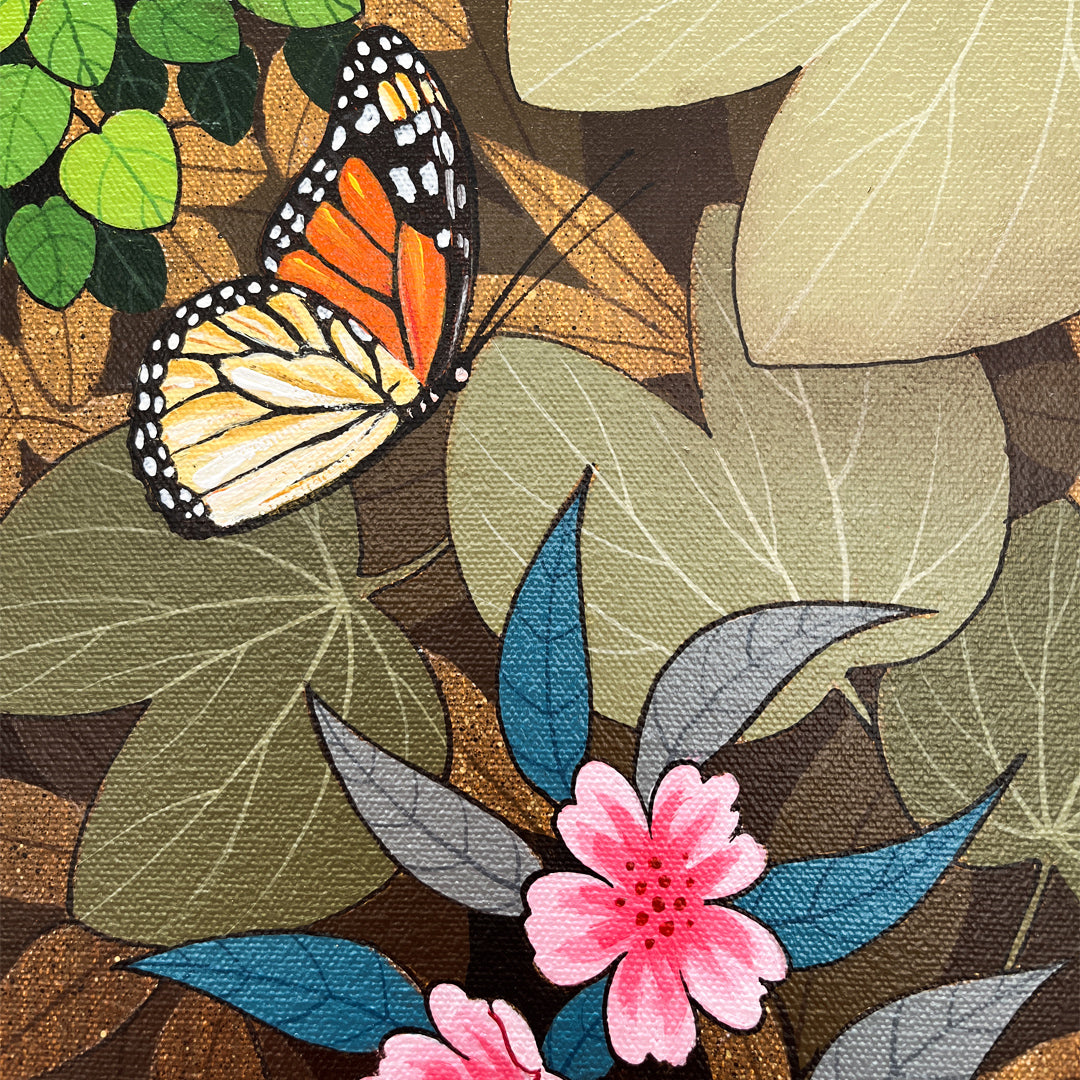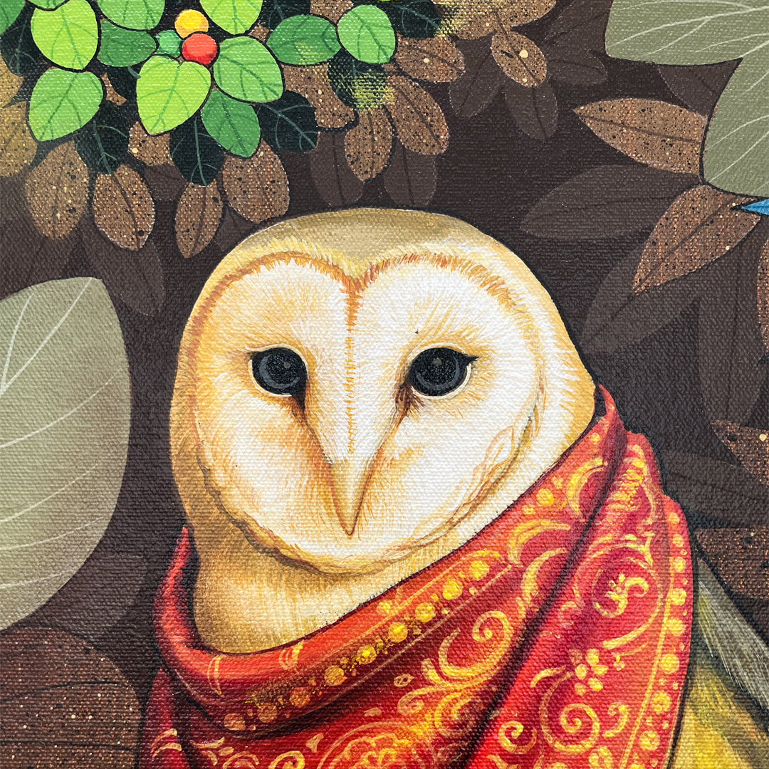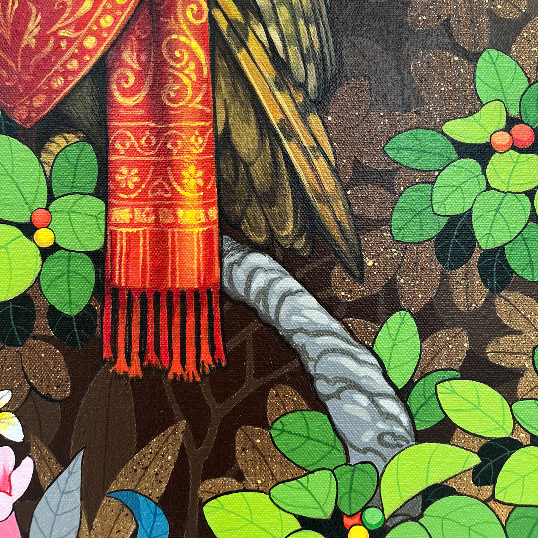 Ganapati Hegde paints half-real, half-imagined worlds, layered with fantastical and unexpected elements that depict the rapturously green and radiant landscape of North Karnataka’s coast where he grew up. ... Hegde’s otherworldly jungle is full of interesting minutiae, and is inhabited by nature’s assorted residents, from caterpillars and chameleons to monkeys and butterflies, alongside a profusion of foliage painted in bright blues, reds, greens and lavenders. Amidst the lushness of Hegde’s vibrant acrylic and oil canvases sit sly anthropomorphic animals and familiar urban objects, including laptops, flags and furniture. While nature and its furry, feathery, and floral protagonists remain centre stage, an undercurrent of fable-like storytelling and sharp wit ripples through his work, compelling viewers to dig beneath the thicket of indigenous plants, flowers, birds, animals and insects.