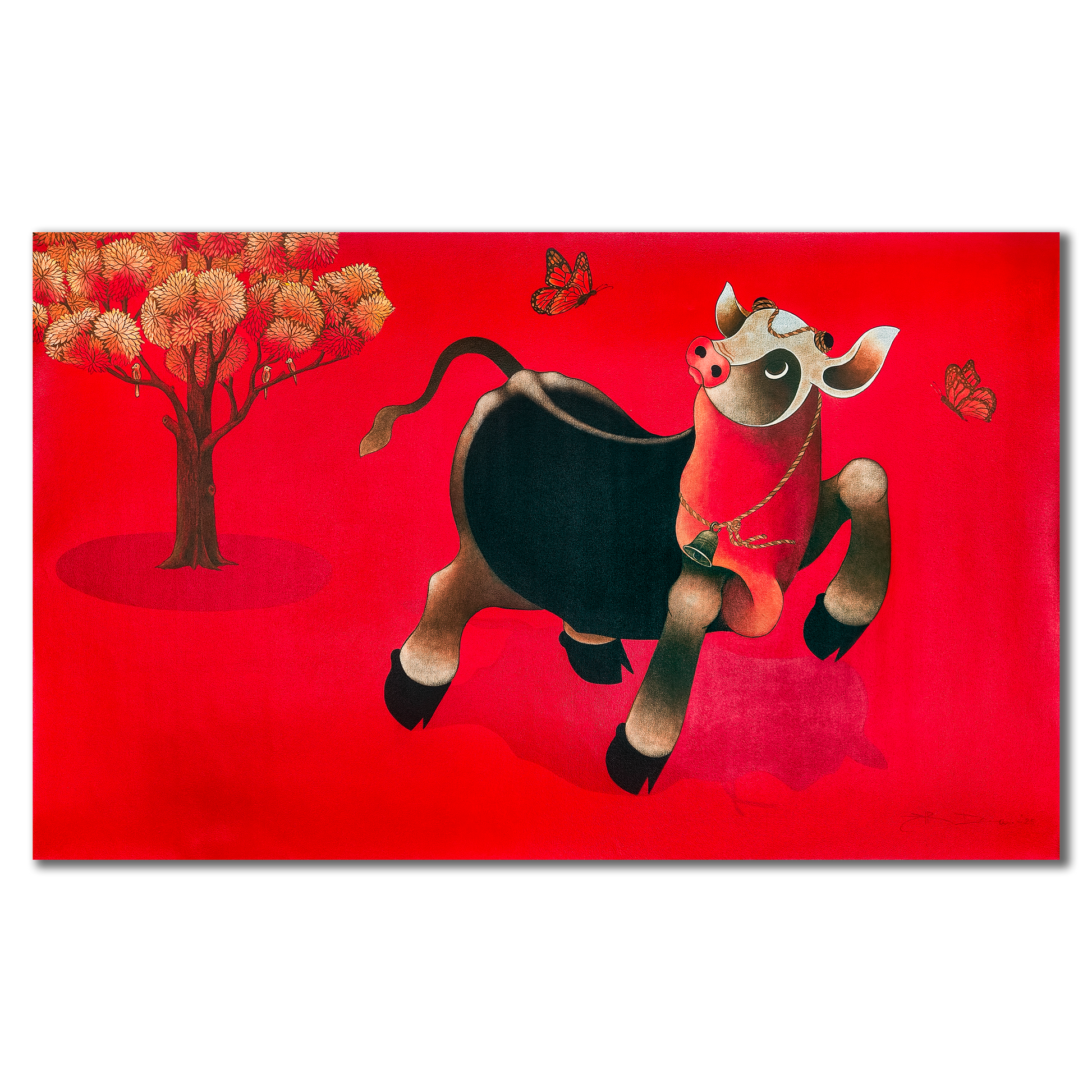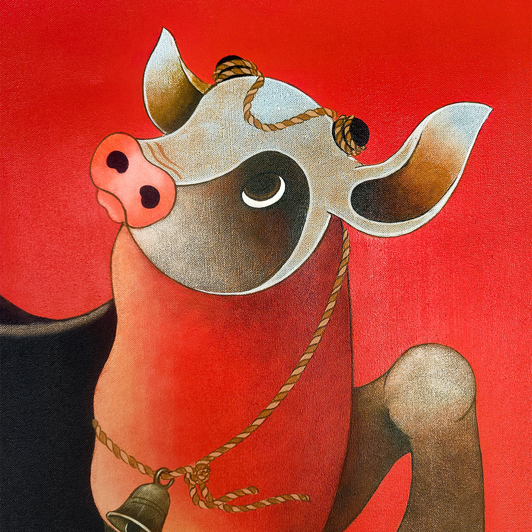 H.R. Das’s signature bulls and cows capture the essence of rural life. His portrayal of these beautiful beasts against an abstract background highlights their sheer magnificence and deep-rooted cultural significance.... HR Das’s kinetic art features unusual protagonists – sacred cows and bulls. Revered in Hindu mythology and an intrinsic part of rural life, cows and bulls frolic, wander and bask through the West Bengal artist’s acrylics-on-canvas. His bovine art captures the many moods, quirks and expressions of these beautiful creatures, ranging from powerful and vital to playful and endearing.