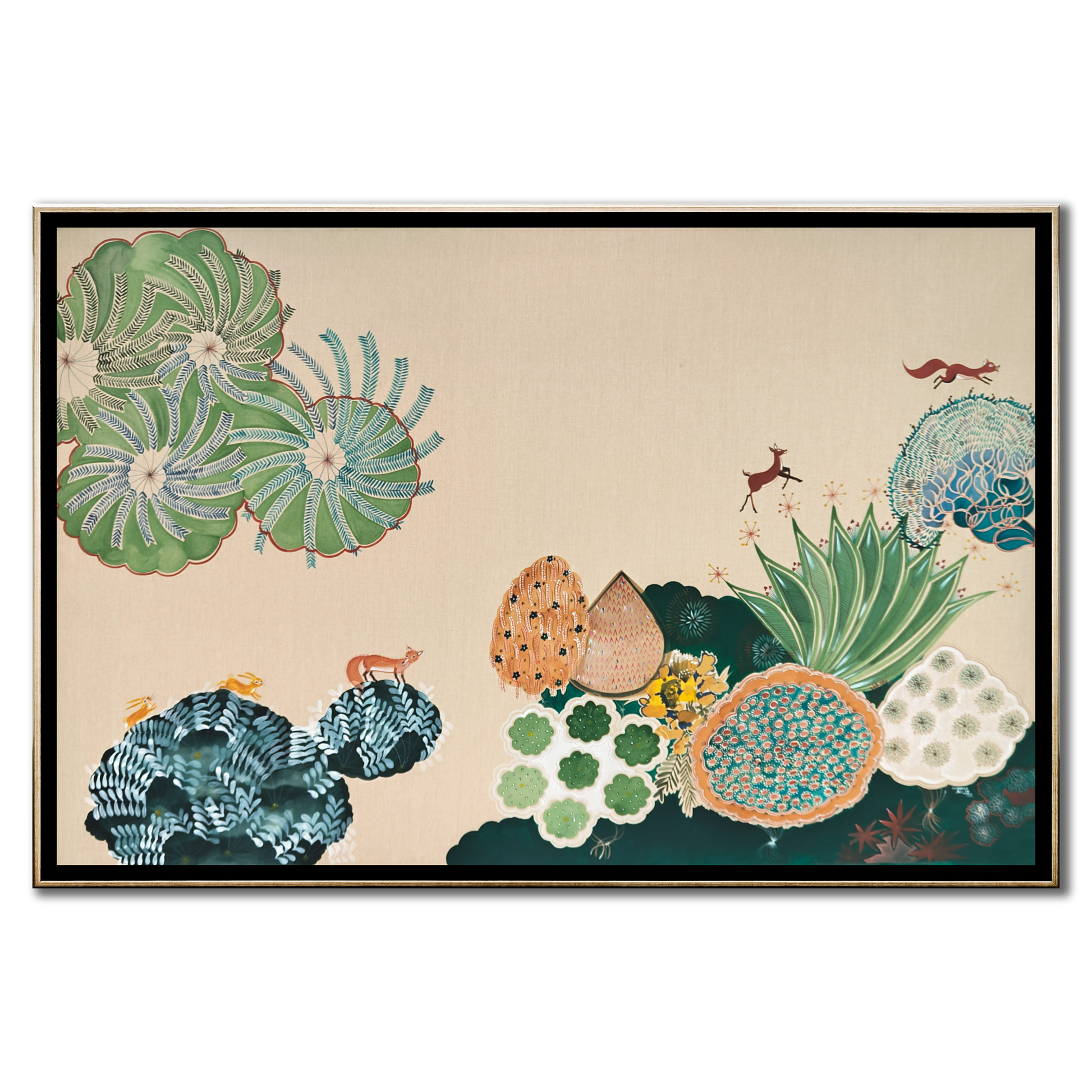 Priyanka Aelay’s acrylic works unfold like magic realist tales filled with birds, beasts, animals, trees and flowers in bold, vibrant colours. Her mythical, enchanted forests are filled with intricate motifs, exquisite patterns and striking imagery. ... On her canvas, age-old folk heritage — particularly from Telangana, from where she hails — is transformed into something that is distinctly contemporary and wholly unique, as she seeks inspiration from the environment and indigenous flora and fauna. Aelay’s paintings reflect the energy, momentum and simplicity of folk art, as well as the aesthetics and language of contemporary art. Paintings do not follow a linear perspective in the artist’s work, as she plays with space, dimensions and perspective to make the landscapes appear free flowing and free floating. Aelay’s works are an invitation to transport and immerse yourself in the unboundedness of nature and the wilderness, something sorely lacking in our urban ecosystems.
