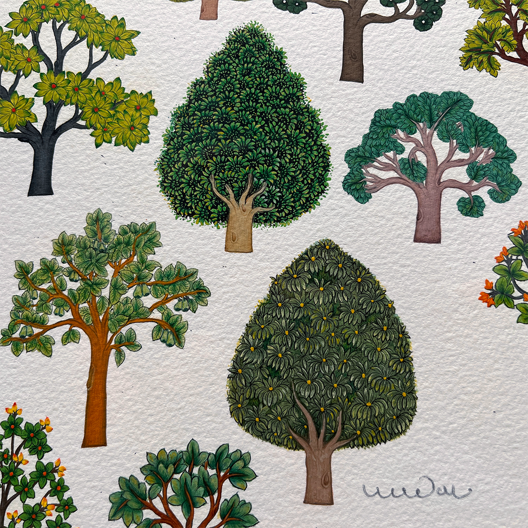 Madan Meena works extensively with rural, nomadic and tribal communities of his native Rajasthan. Through their last living practitioners, he delves into the state’s oldest folk traditions, documenting their lives in a bid to preserve their identities. ... As a practitioner, Meena revisits the languishing craft traditions of his birthplace, not only studying them as an academic, but reviving them as an artist. The classic Nayak and Nayika in his works are reimagined through a contemporary lens--the Barahmsa series is an expression of their emotions, told through the motifs of animals, while the Selfie series puts them in the centre of changing social milieu. In his preservation of lost or extinct artistic practices, he adds a contemporary flourish, as in his work drawn from the Kota and Bundi styles of miniature painting, in collaboration with local miniature artists. An artist and researcher, his doctoral thesis, “Art of the Meena Tribe,” which focused on the traditions of his own ancestral community, was accompanied by an exhibition of wall paintings by the women of the tribe. A recurring theme throughout his work is nostalgia, and the nomadic traveller’s longing for his homeland.