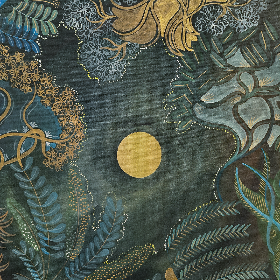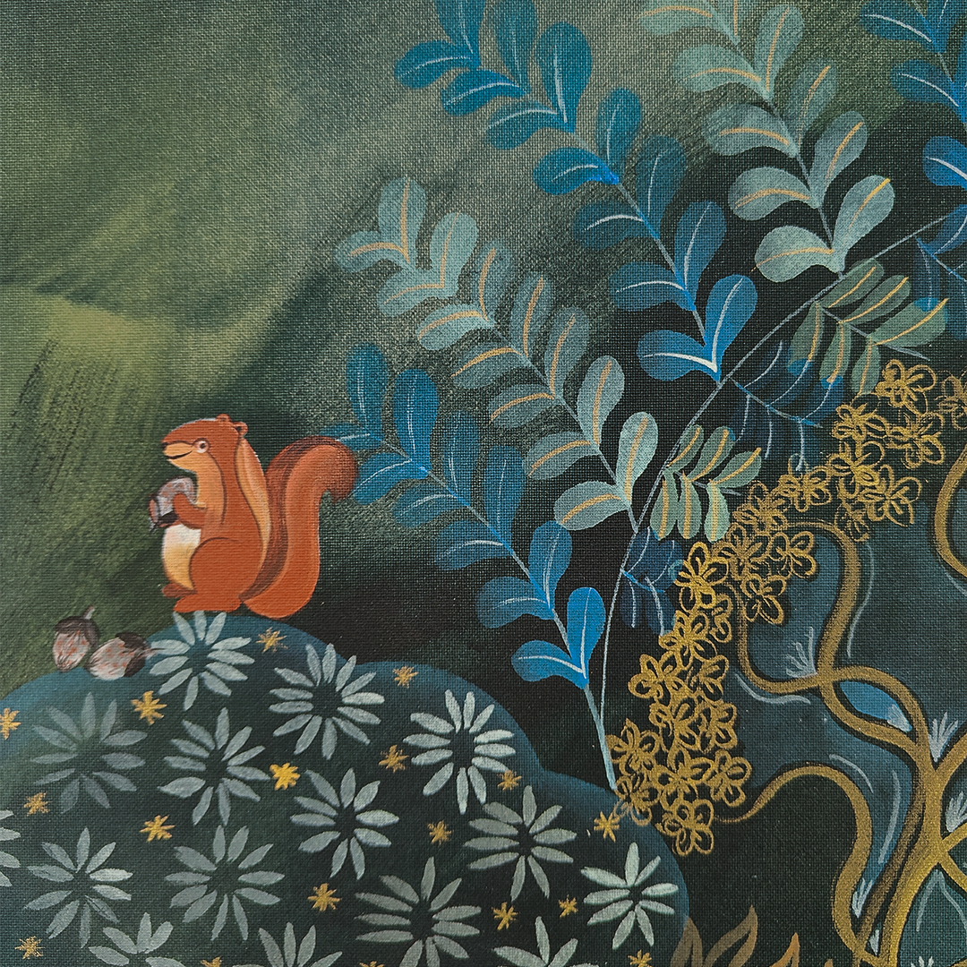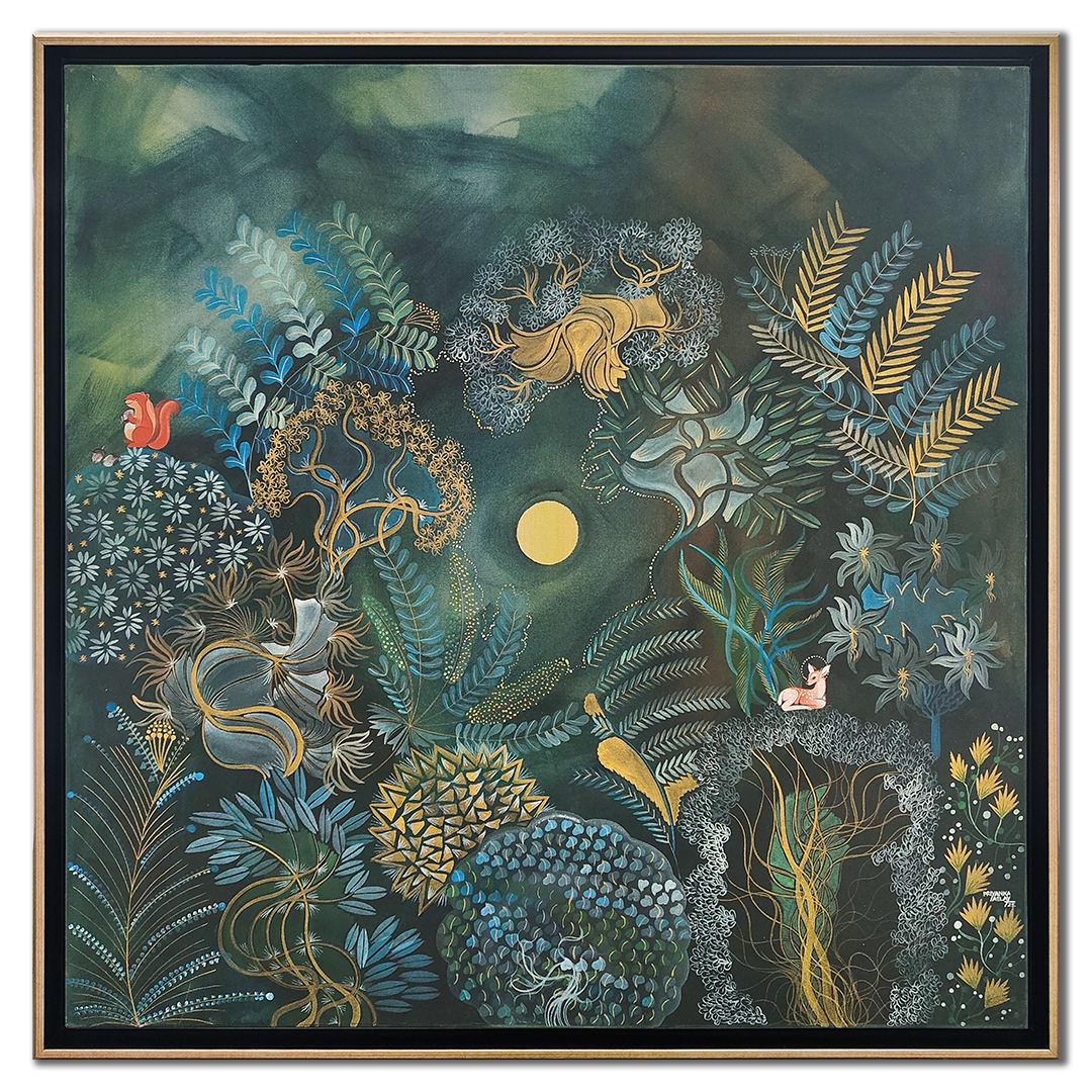 Priyanka Aelay’s acrylic works unfold like magic realist tales filled with birds, beasts, animals, trees and flowers in bold, vibrant colours. Her mythical, enchanted forests are filled with intricate motifs, exquisite patterns and striking imagery. ... On her canvas, age-old folk heritage — particularly from Telangana, from where she hails — is transformed into something that is distinctly contemporary and wholly unique, as she seeks inspiration from the environment and indigenous flora and fauna. Aelay’s paintings reflect the energy, momentum and simplicity of folk art, as well as the aesthetics and language of contemporary art. Paintings do not follow a linear perspective in the artist’s work, as she plays with space, dimensions and perspective to make the landscapes appear free flowing and free floating. Aelay’s works are an invitation to transport and immerse yourself in the unboundedness of nature and the wilderness, something sorely lacking in our urban ecosystems.