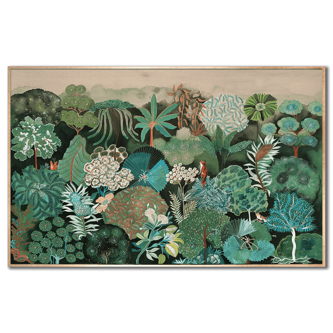 Priyanka Aelay’s acrylic works unfold like magic realist tales filled with birds, beasts, animals, trees and flowers in bold, vibrant colours. Her mythical, enchanted forests are filled with intricate motifs, exquisite patterns and striking imagery. ... On her canvas, age-old folk heritage — particularly from Telangana, from where she hails — is transformed into something that is distinctly contemporary and wholly unique, as she seeks inspiration from the environment and indigenous flora and fauna. Aelay’s paintings reflect the energy, momentum and simplicity of folk art, as well as the aesthetics and language of contemporary art. Paintings do not follow a linear perspective in the artist’s work, as she plays with space, dimensions and perspective to make the landscapes appear free flowing and free floating. Aelay’s works are an invitation to transport and immerse yourself in the unboundedness of nature and the wilderness, something sorely lacking in our urban ecosystems.