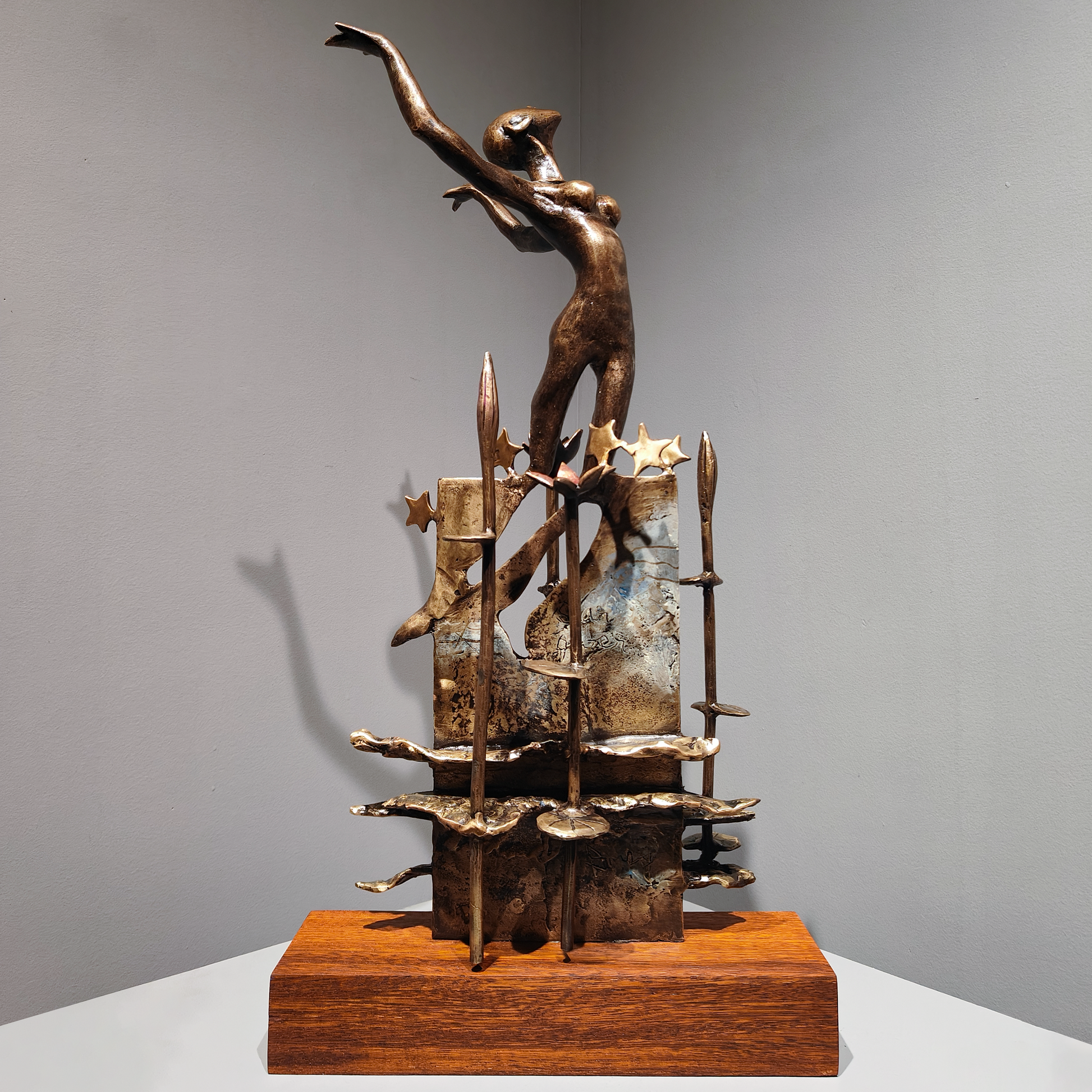 Dimpy Menon was the first Indian sculptor to win the Lorenzo il Magnifico Bronze Award at the Florence Biennale. Dimpy has been called a “Natural” by World Sculpturemagazine which said, “She captures the graceful, acrobatic movements of the human body with rare sensitivity.” Dimpy has had several exhibitions in India and abroad.... When the Oberoi Hotel in Mumbai re-opened its lobby after the terror attacks of 26/11 a prominent change was a bronze sculpture there by Dimpy. The seven-foot composition has been described as “stunning” by the travel guru Mary Gostelow. Dimpy’s works have been specially commissioned by some of the largest hotel chains and corporate houses, including The Oberoi, The Leela, The Marriott, The Holiday Inn, Crowne Plaza, TVS, Indo-Us Venture, General Electric, National Semiconductor, UKN, Total Environment, VR Bengaluru, World Trade Centre (Pune), The 42, Kolkata, Bengaluru International Exhibition Centre. The CNN International told its patrons, “Don't miss the sculptures by Dimpy Menon dotted around the premises at the Trident in Bandra-Kurla.” Open magazine pointed out that “Menon’s figures seem to defy the laws of physics… and yet, the muscled human bodies excite the viewers…”