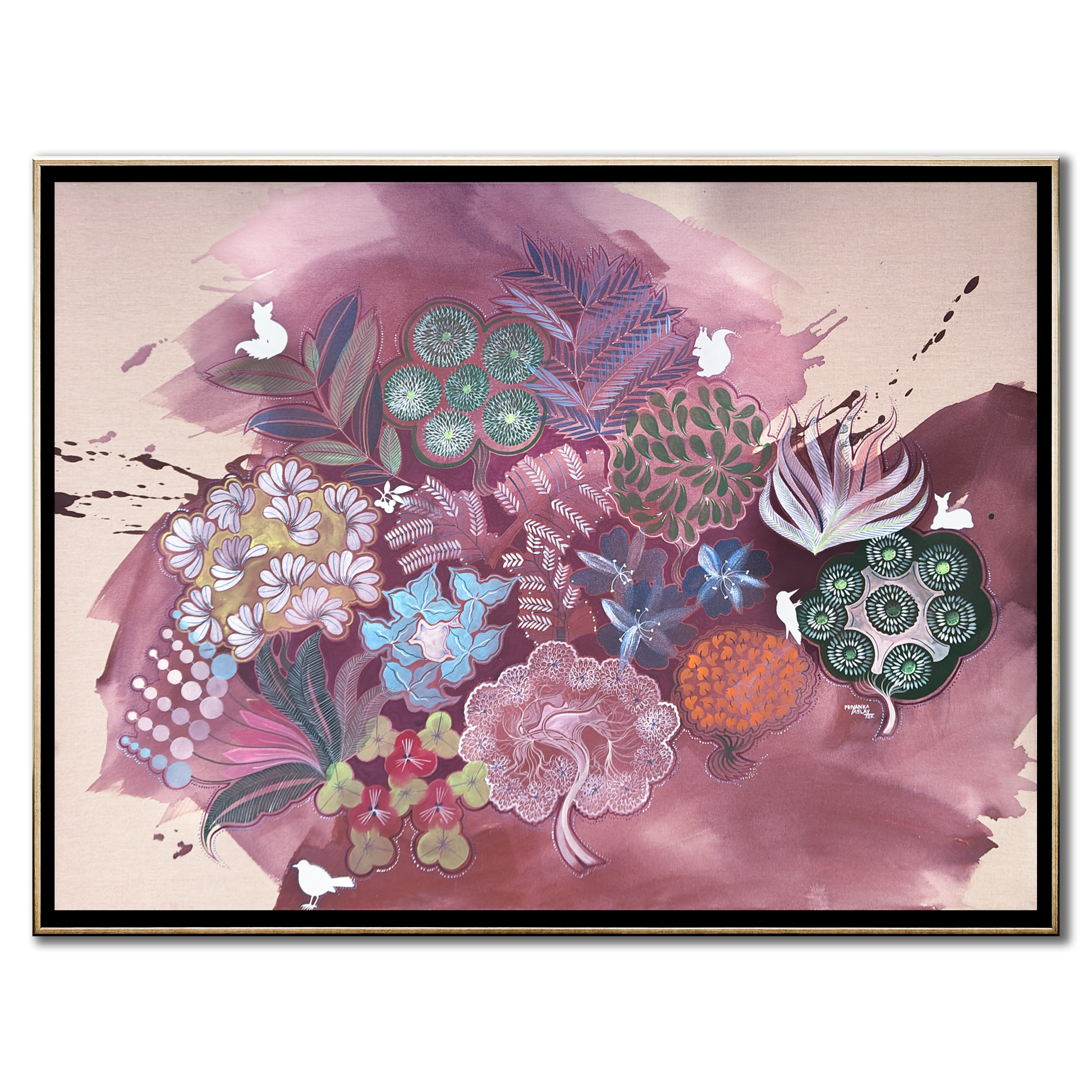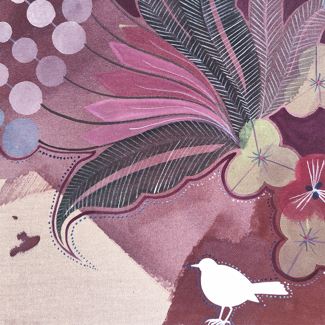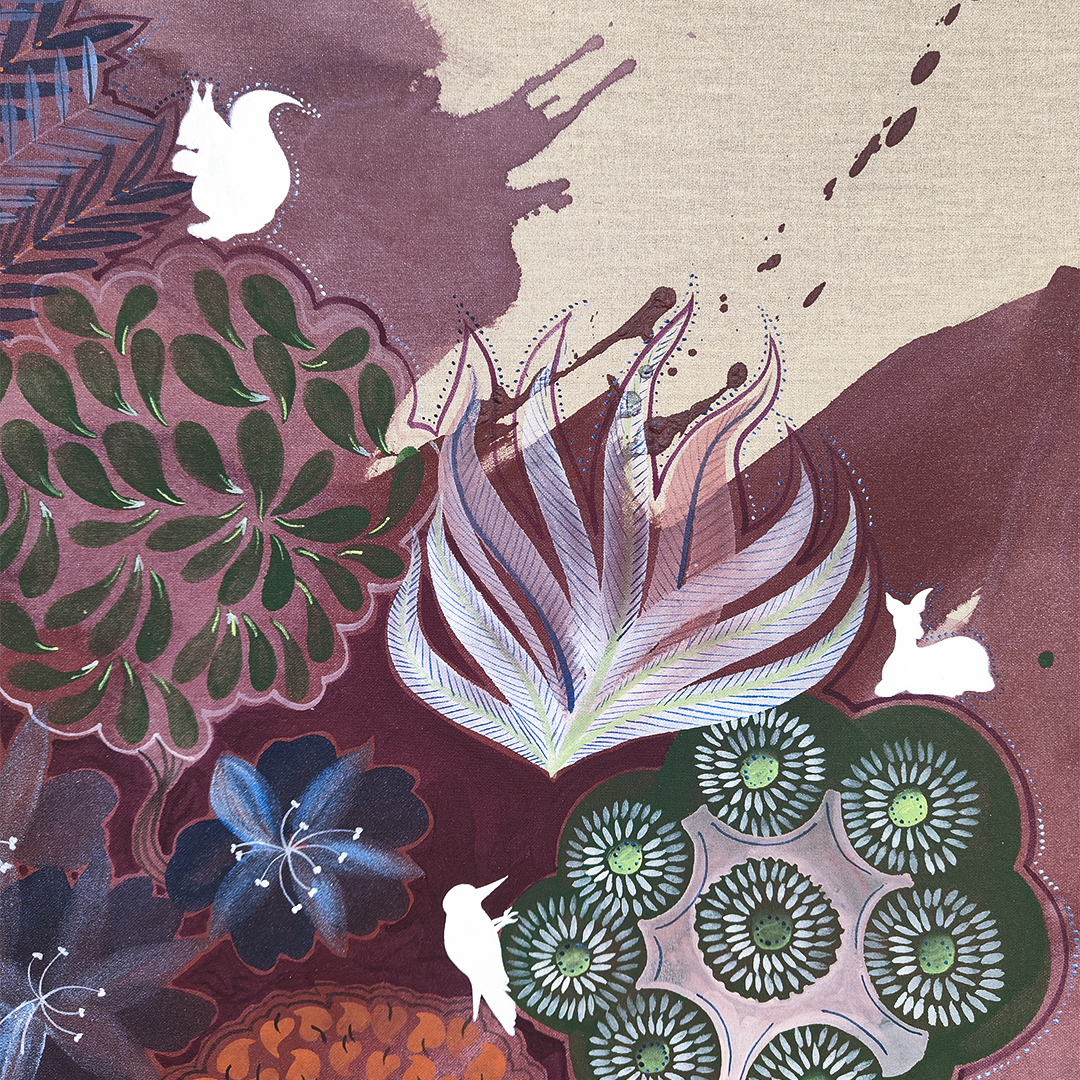 Priyanka Aelay’s acrylic works unfold like magic realist tales filled with birds, beasts, animals, trees and flowers in bold, vibrant colours. Her mythical, enchanted forests are filled with intricate motifs, exquisite patterns and striking imagery. ... On her canvas, age-old folk heritage — particularly from Telangana, from where she hails — is transformed into something that is distinctly contemporary and wholly unique, as she seeks inspiration from the environment and indigenous flora and fauna. Aelay’s paintings reflect the energy, momentum and simplicity of folk art, as well as the aesthetics and language of contemporary art. Paintings do not follow a linear perspective in the artist’s work, as she plays with space, dimensions and perspective to make the landscapes appear free flowing and free floating. Aelay’s works are an invitation to transport and immerse yourself in the unboundedness of nature and the wilderness, something sorely lacking in our urban ecosystems.