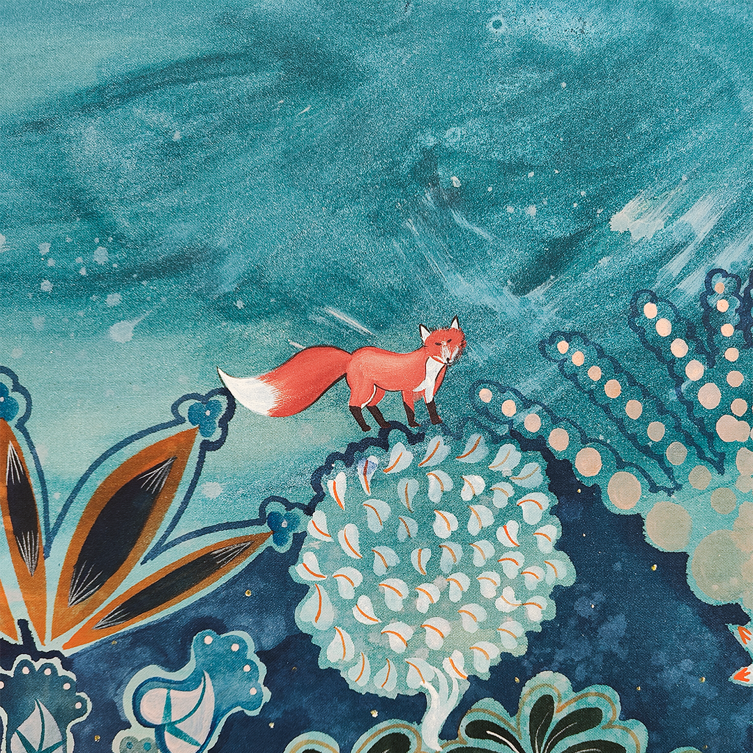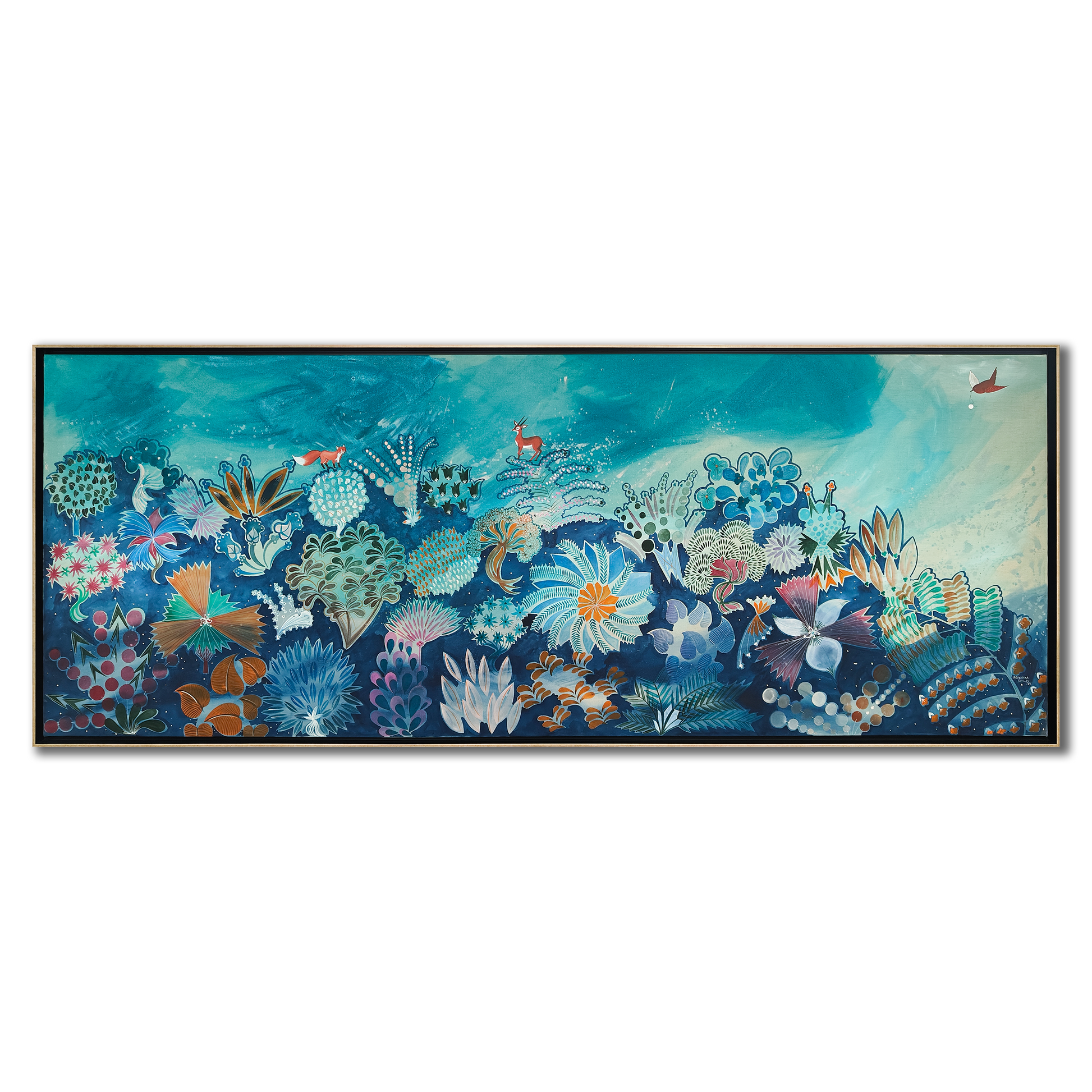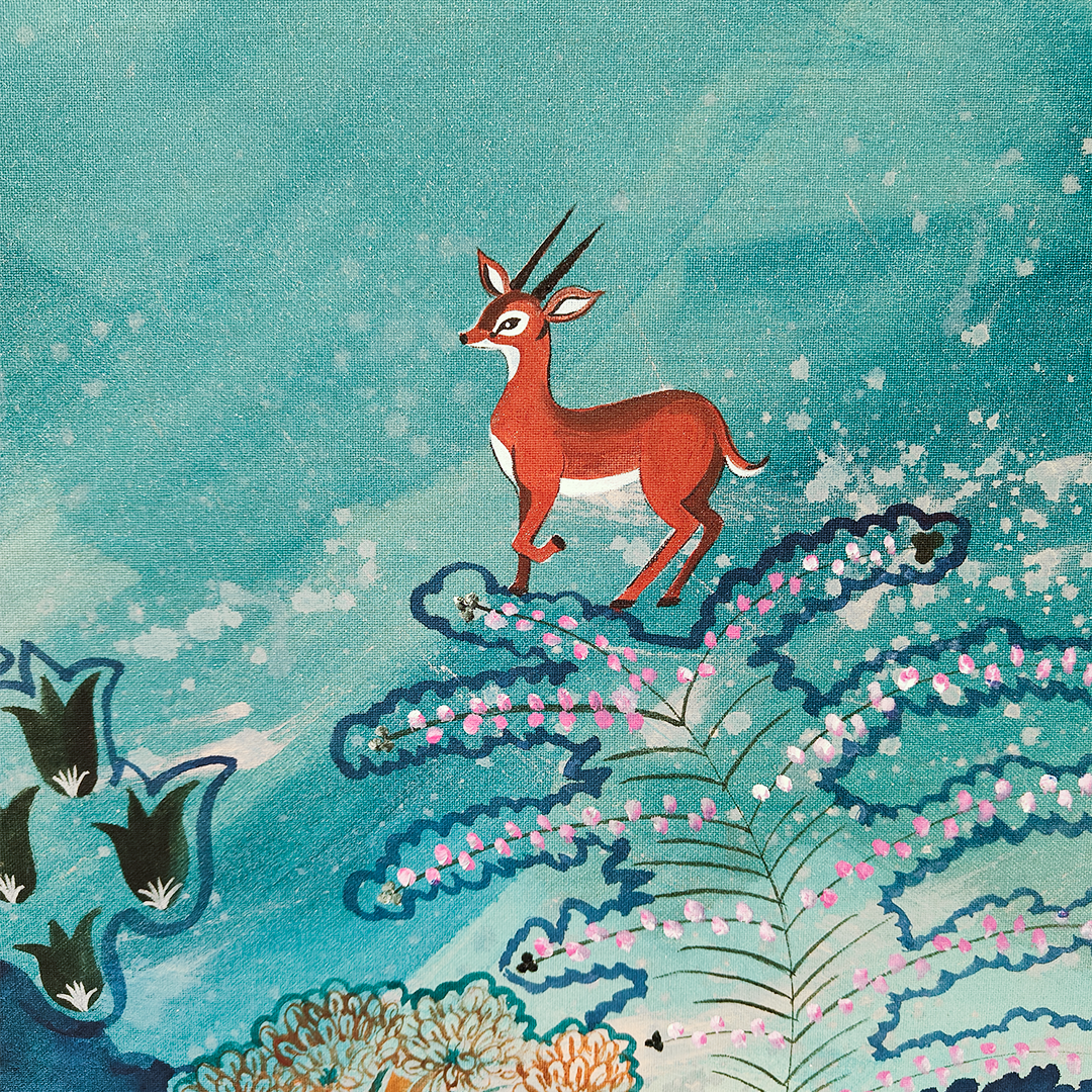Priyanka Aelay’s acrylic works unfold like magic realist tales filled with birds, beasts, animals, trees and flowers in bold, vibrant colours. Her mythical, enchanted forests are filled with intricate motifs, exquisite patterns and striking imagery. ... On her canvas, age-old folk heritage — particularly from Telangana, from where she hails — is transformed into something that is distinctly contemporary and wholly unique, as she seeks inspiration from the environment and indigenous flora and fauna. Aelay’s paintings reflect the energy, momentum and simplicity of folk art, as well as the aesthetics and language of contemporary art. Paintings do not follow a linear perspective in the artist’s work, as she plays with space, dimensions and perspective to make the landscapes appear free flowing and free floating. Aelay’s works are an invitation to transport and immerse yourself in the unboundedness of nature and the wilderness, something sorely lacking in our urban ecosystems.