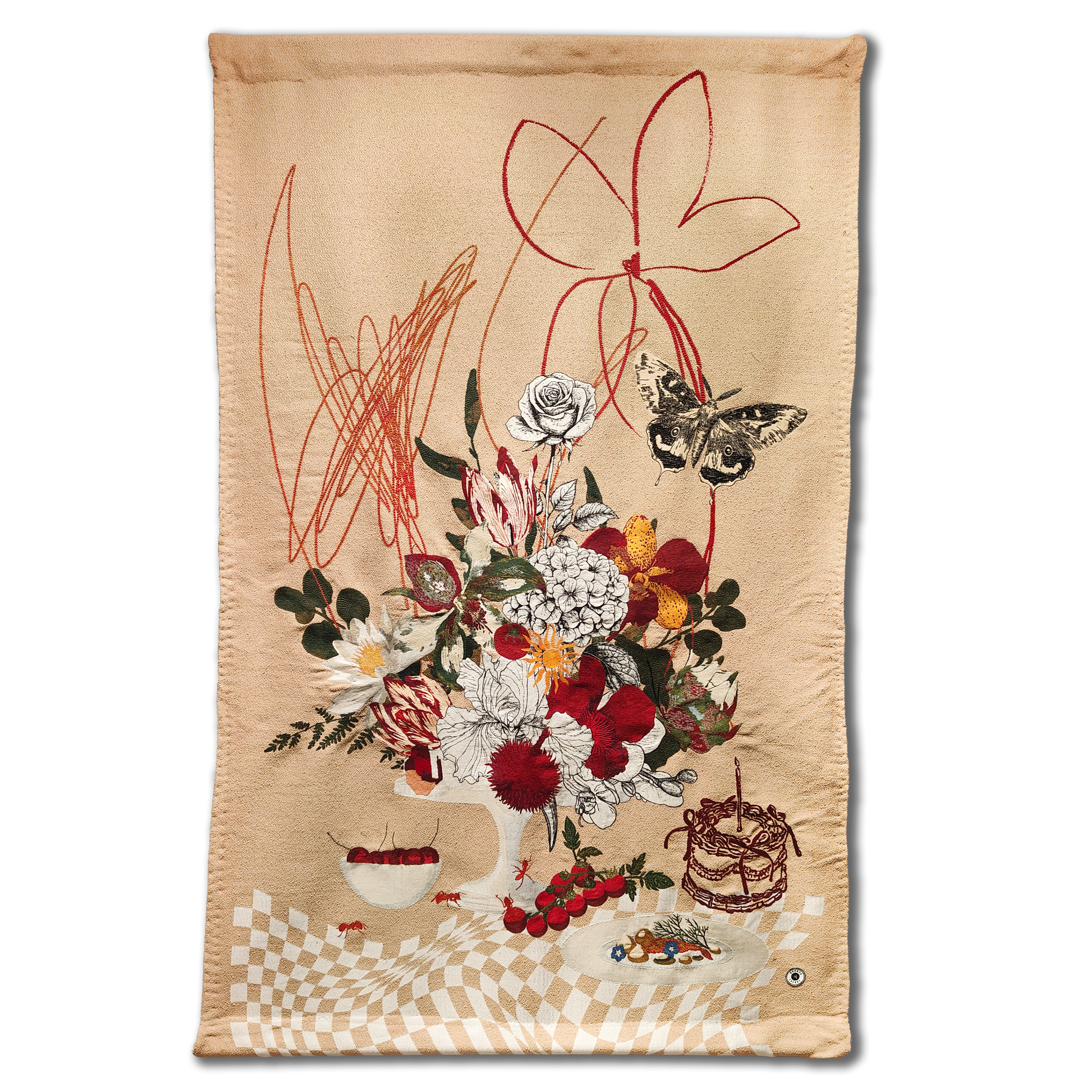 Rakhee Shenoy’s surreal still life collages transport you to a realm of wonder, comfort and escape. The textile artist’s dreamy works delight in the art of crossovers and flipping how we view reality. Layered and fluid mixed media works merge internal and external worlds as they spill over onto a single frame. Personal objects, memories and machines share space with wildflowers, vegetation, fruits and insects in a mind-bending mish-mash.... A fish swims over a bowl of oranges and past a grocery bag over which an ant makes its way. With intriguing layers, textures, textual details, the artworks are made using embroidery, painting, hand-drawing and digital art. Shenoy adds symbols of personal significance and nature-based muses like silk moths, butterflies and fish, which represent freedom and beauty.