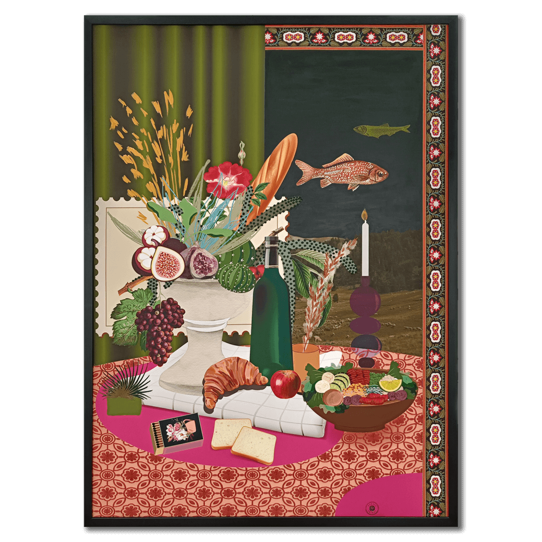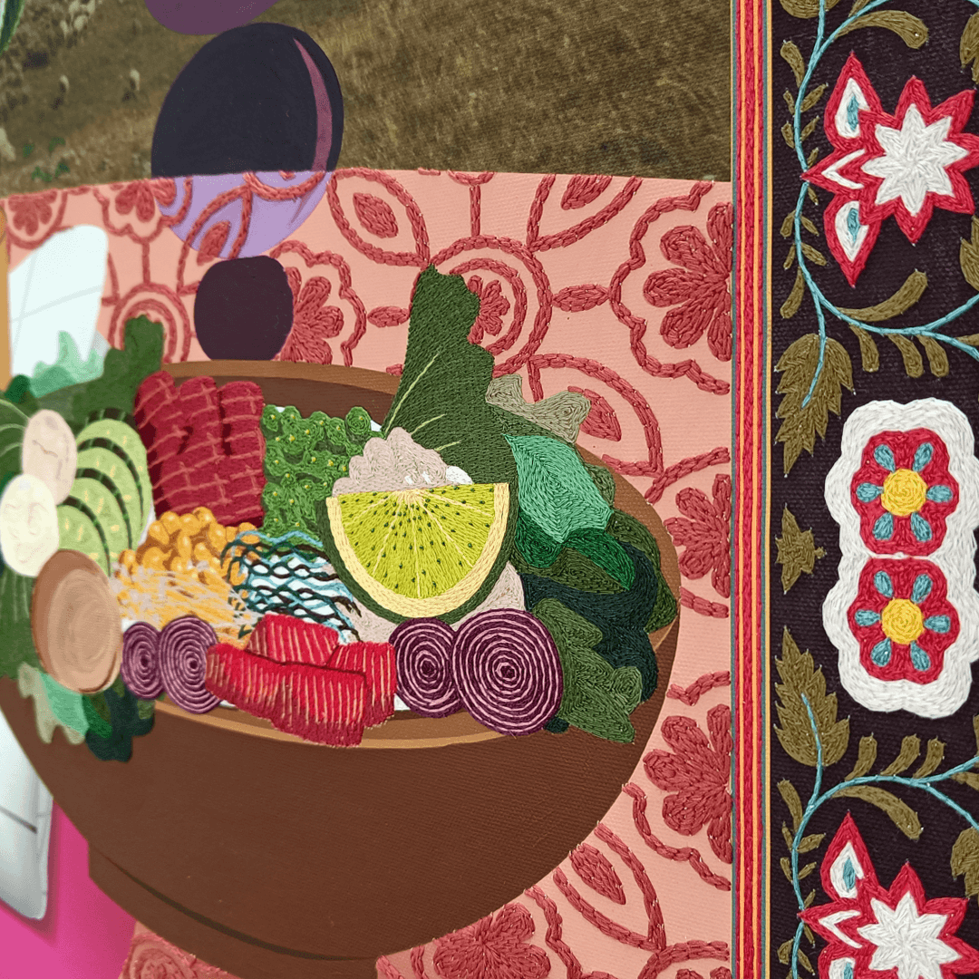 Rakhee Shenoy’s surreal still life collages transport you to a realm of wonder, comfort and escape. The textile artist’s dreamy works delight in the art of crossovers and flipping how we view reality. Layered and fluid mixed media works merge internal and external worlds as they spill over onto a single frame. Personal objects, memories and machines share space with wildflowers, vegetation, fruits and insects in a mind-bending mish-mash.... A fish swims over a bowl of oranges and past a grocery bag over which an ant makes its way. With intriguing layers, textures, textual details, the artworks are made using embroidery, painting, hand-drawing and digital art. Shenoy adds symbols of personal significance and nature-based muses like silk moths, butterflies and fish, which represent freedom and beauty.