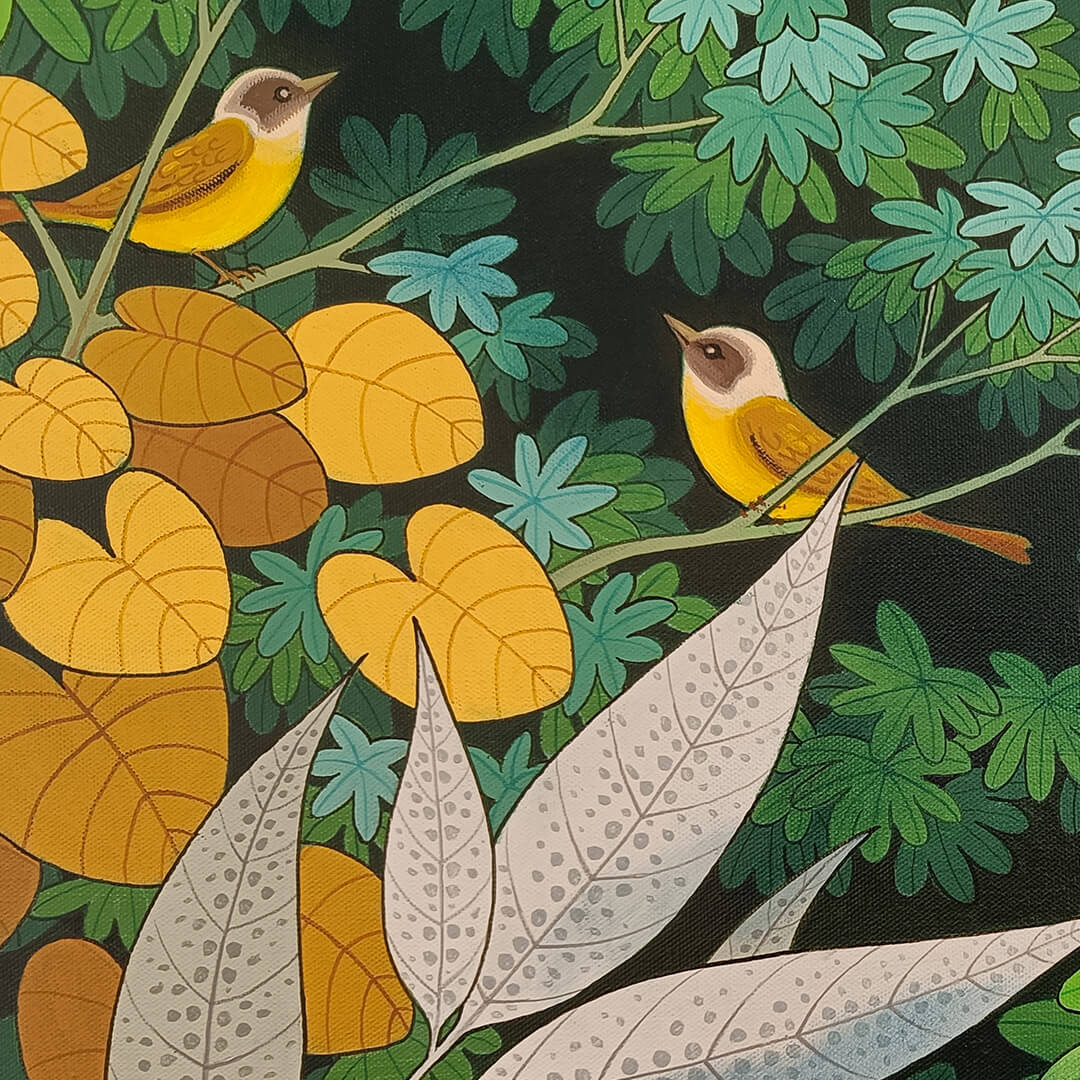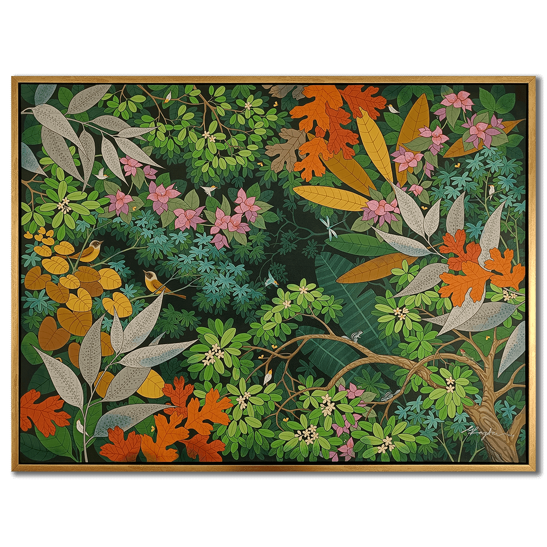 Ganapati Hegde paints half-real, half-imagined worlds, layered with fantastical and unexpected elements that depict the rapturously green and radiant landscape of North Karnataka’s coast where he grew up. ... Hegde’s otherworldly jungle is full of interesting minutiae, and is inhabited by nature’s assorted residents, from caterpillars and chameleons to monkeys and butterflies, alongside a profusion of foliage painted in bright blues, reds, greens and lavenders. Amidst the lushness of Hegde’s vibrant acrylic and oil canvases sit sly anthropomorphic animals and familiar urban objects, including laptops, flags and furniture. While nature and its furry, feathery, and floral protagonists remain centre stage, an undercurrent of fable-like storytelling and sharp wit ripples through his work, compelling viewers to dig beneath the thicket of indigenous plants, flowers, birds, animals and insects.