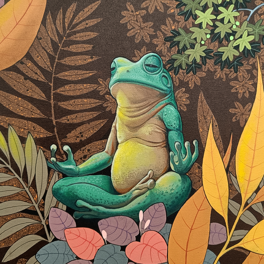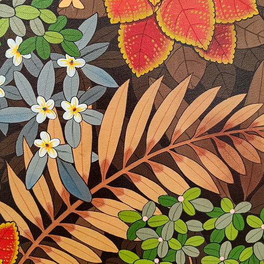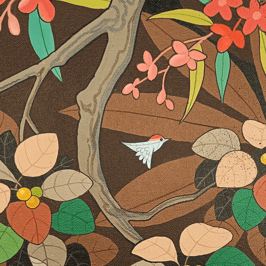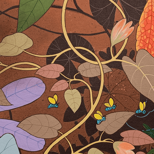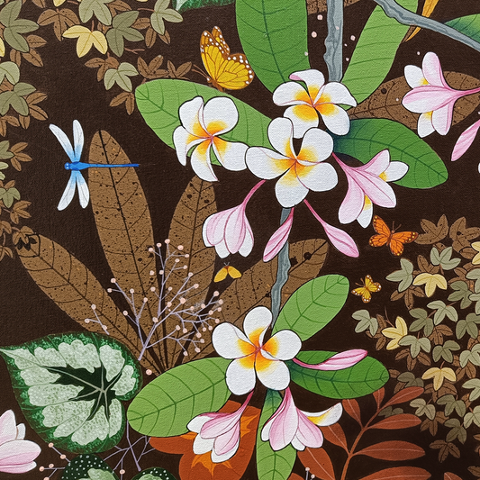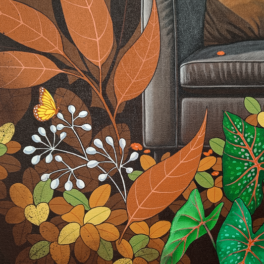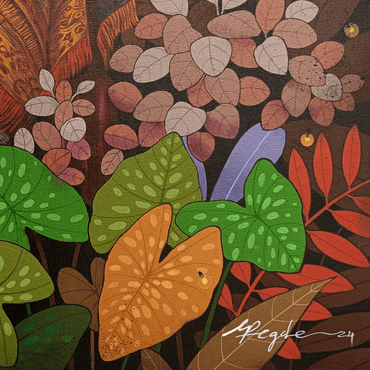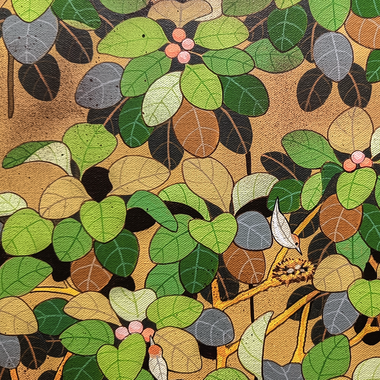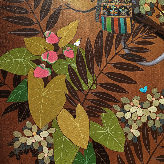 Ganapati Hegde paints half-real, half-imagined worlds, layered with fantastical and unexpected elements that depict the rapturously green and radiant landscape of North Karnataka’s coast where he grew up. ... Hegde’s otherworldly jungle is full of interesting minutiae, and is inhabited by nature’s assorted residents, from caterpillars and chameleons to monkeys and butterflies, alongside a profusion of foliage painted in bright blues, reds, greens and lavenders. Amidst the lushness of Hegde’s vibrant acrylic and oil canvases sit sly anthropomorphic animals and familiar urban objects, including laptops, flags and furniture. While nature and its furry, feathery, and floral protagonists remain centre stage, an undercurrent of fable-like storytelling and sharp wit ripples through his work, compelling viewers to dig beneath the thicket of indigenous plants, flowers, birds, animals and insects.