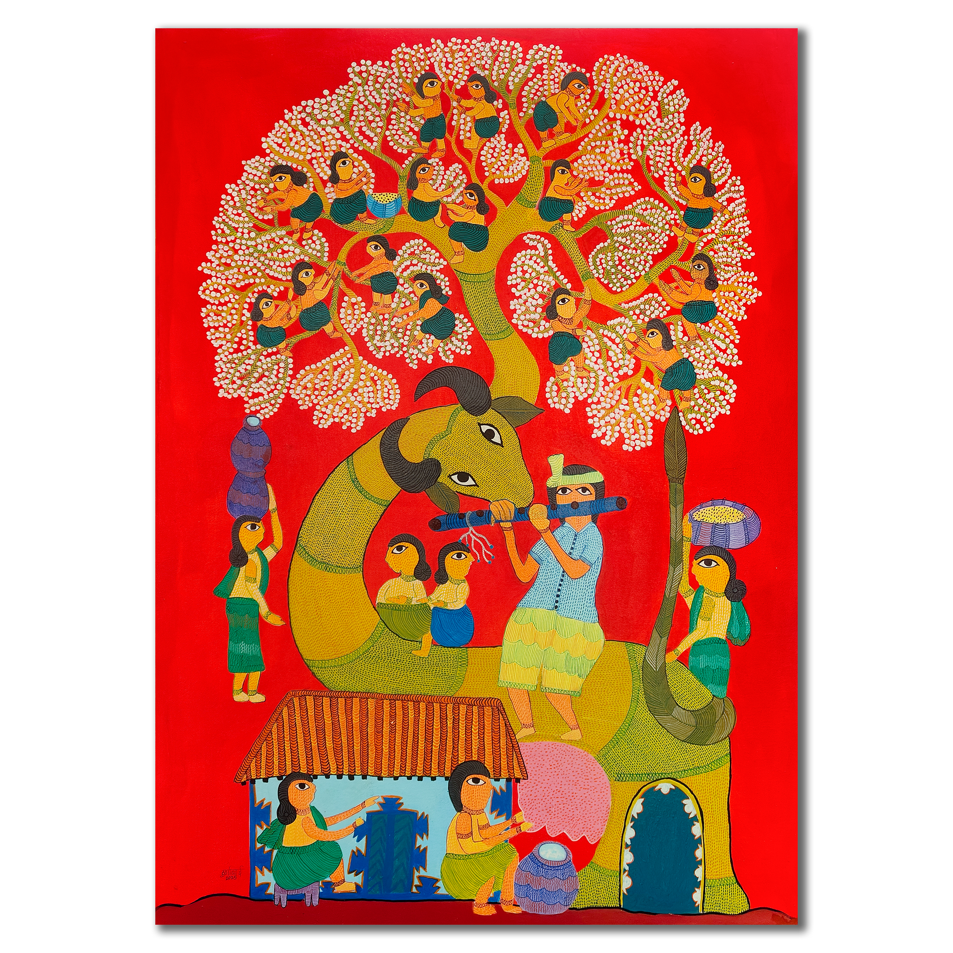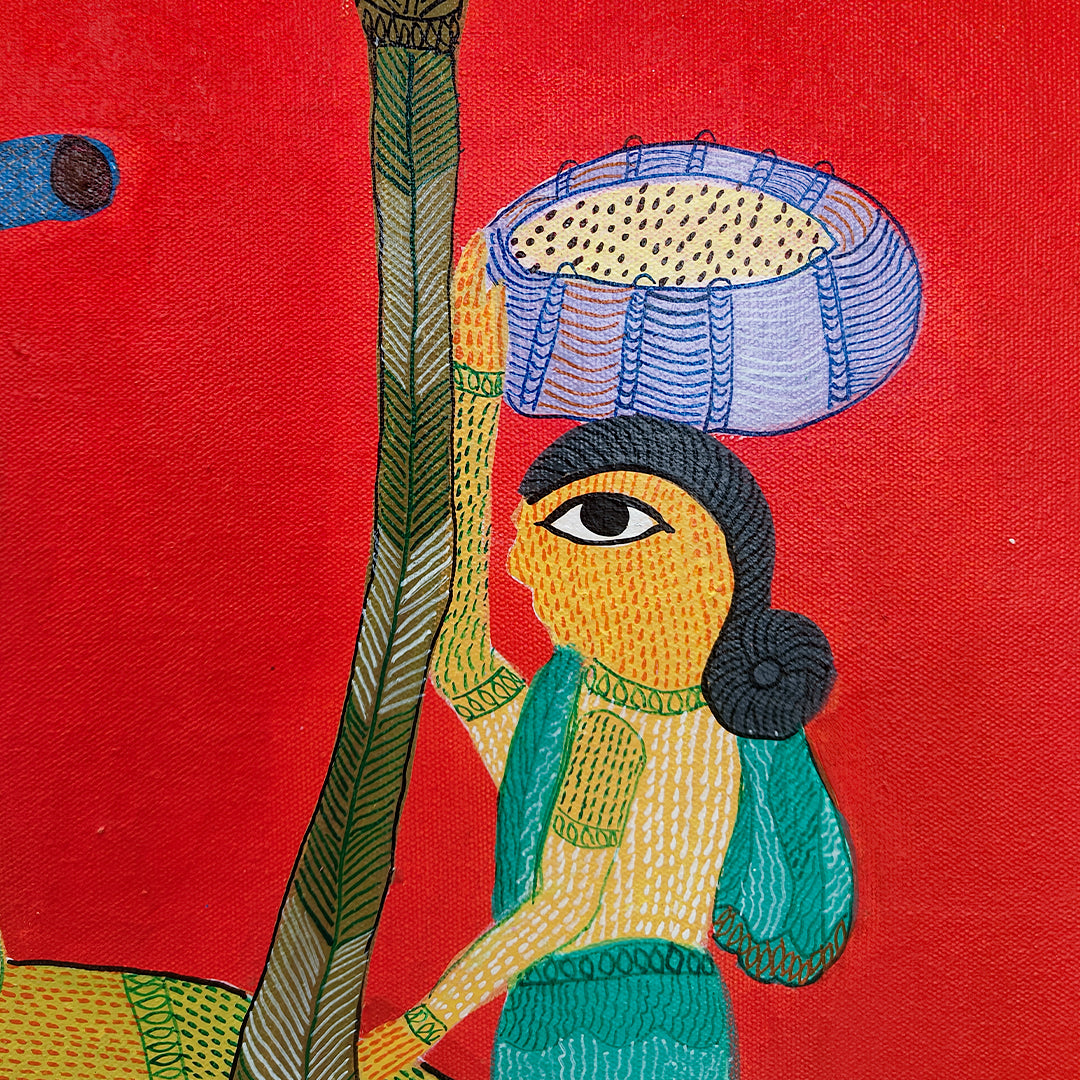 Durgabai Vyam is one of the foremost female artists working in the Pardhan-Gond tradition of tribal art. Although she lives and works in Bhopal, most of Durgabai’s work is rooted in the rich folklore and mythologies of her birthplace, Burbaspur, a village in the Mandla district of Madhya Pradesh. Her art is inspired by the stories she heard as a child from her grandmother.... Post her marriage to Subhash Vyam, she was encouraged by her brother-in-law, Jangarh Singh Shyam, who noticed her talent as a painter of digna (ritual paintings made by the women on the floors and walls of houses). He spurred her to not only translate her talents on to paper and canvas but also to experiment with her aesthetics in keeping with a contemporary urban art market. Even while using the pointillist dots, fine dashes and minute waves that characterise Pardhan-Gond painting, Durgabai’s use of vibrant colours for the stippling is part of her unique voice, and is matched by the fable-like quality of her paintings. They present a range of goddesses, rivers, trees, a variety of animals from tigers and deer to peacocks and garden lizards, and occasionally male gods – all rendered in her original and very contemporary style. Durgabai is also the author and illustrator of several books.