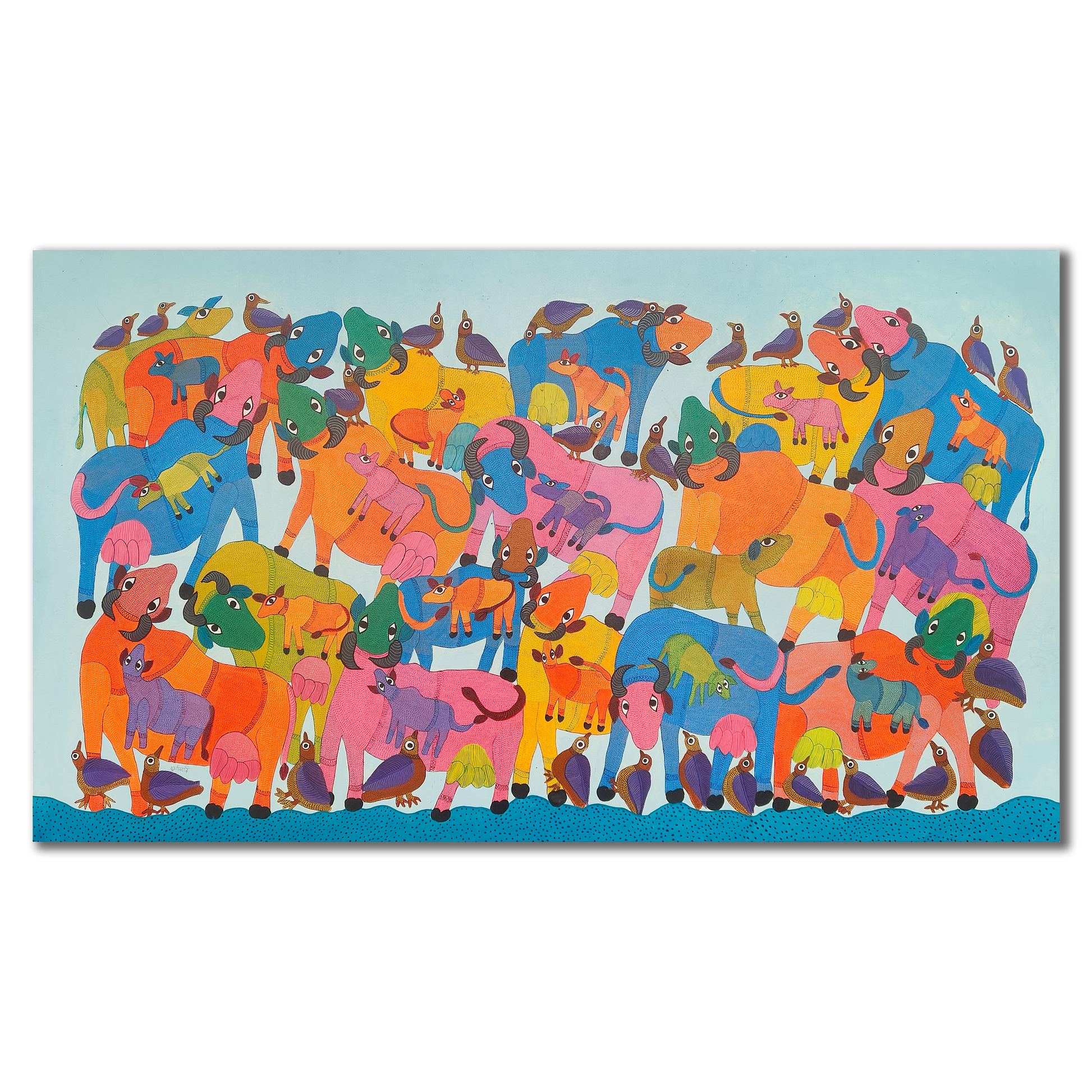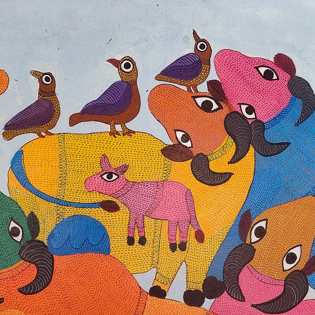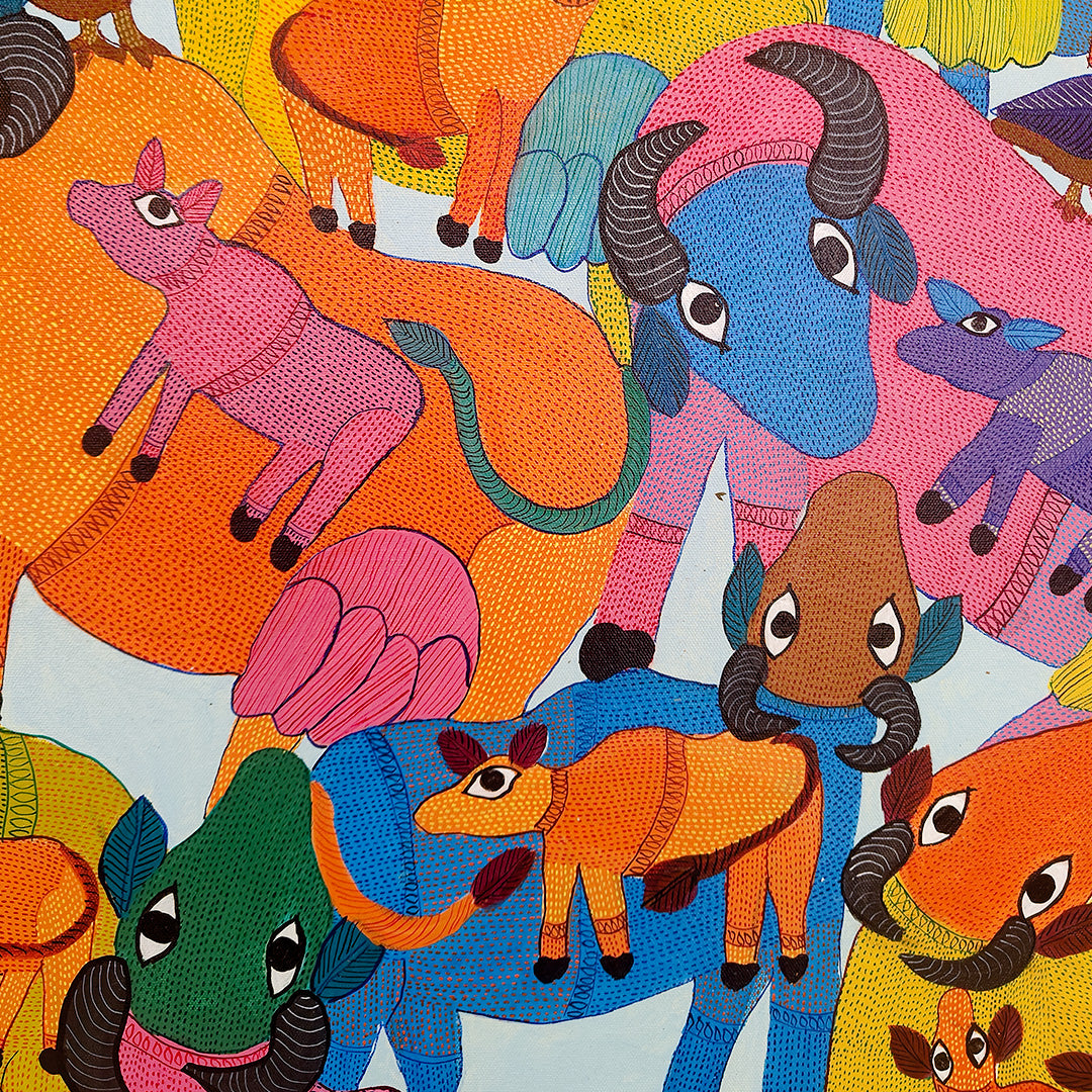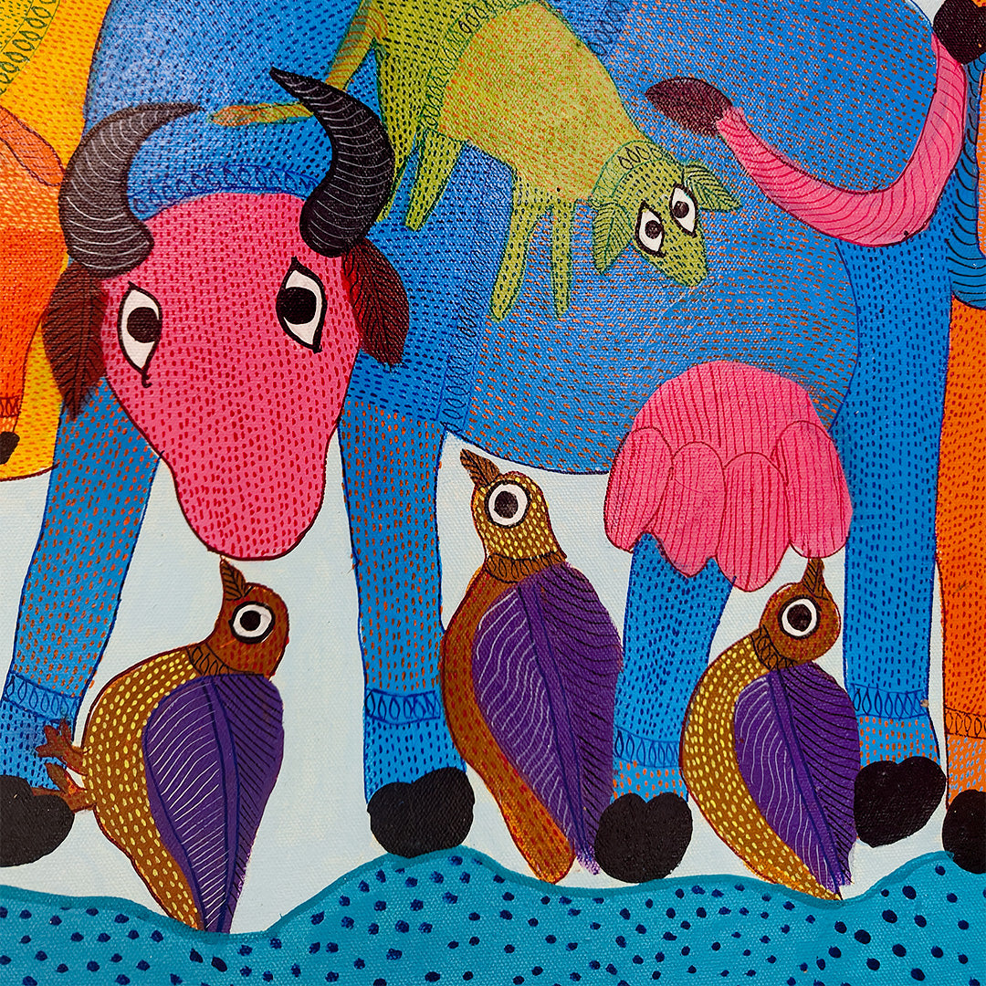 Durgabai Vyam is one of the foremost female artists working in the Pardhan-Gond tradition of tribal art. Although she lives and works in Bhopal, most of Durgabai’s work is rooted in the rich folklore and mythologies of her birthplace, Burbaspur, a village in the Mandla district of Madhya Pradesh. Her art is inspired by the stories she heard as a child from her grandmother.... Post her marriage to Subhash Vyam, she was encouraged by her brother-in-law, Jangarh Singh Shyam, who noticed her talent as a painter of digna (ritual paintings made by the women on the floors and walls of houses). He spurred her to not only translate her talents on to paper and canvas but also to experiment with her aesthetics in keeping with a contemporary urban art market. Even while using the pointillist dots, fine dashes and minute waves that characterise Pardhan-Gond painting, Durgabai’s use of vibrant colours for the stippling is part of her unique voice, and is matched by the fable-like quality of her paintings. They present a range of goddesses, rivers, trees, a variety of animals from tigers and deer to peacocks and garden lizards, and occasionally male gods – all rendered in her original and very contemporary style. Durgabai is also the author and illustrator of several books.