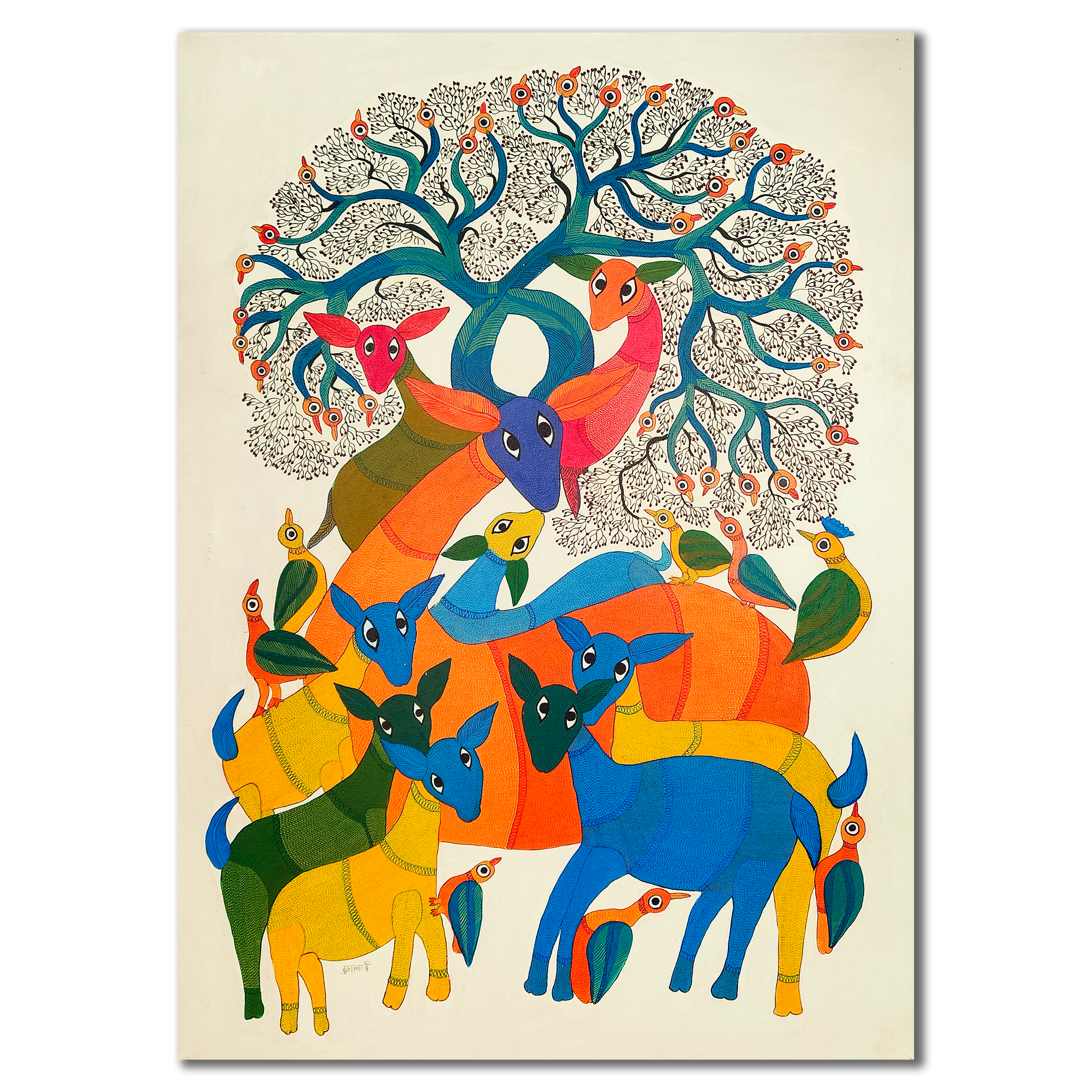 Durgabai Vyam is one of the foremost female artists working in the Pardhan-Gond tradition of tribal art. Although she lives and works in Bhopal, most of Durgabai’s work is rooted in the rich folklore and mythologies of her birthplace, Burbaspur, a village in the Mandla district of Madhya Pradesh. Her art is inspired by the stories she heard as a child from her grandmother.... Post her marriage to Subhash Vyam, she was encouraged by her brother-in-law, Jangarh Singh Shyam, who noticed her talent as a painter of digna (ritual paintings made by the women on the floors and walls of houses). He spurred her to not only translate her talents on to paper and canvas but also to experiment with her aesthetics in keeping with a contemporary urban art market. Even while using the pointillist dots, fine dashes and minute waves that characterise Pardhan-Gond painting, Durgabai’s use of vibrant colours for the stippling is part of her unique voice, and is matched by the fable-like quality of her paintings. They present a range of goddesses, rivers, trees, a variety of animals from tigers and deer to peacocks and garden lizards, and occasionally male gods – all rendered in her original and very contemporary style. Durgabai is also the author and illustrator of several books.
