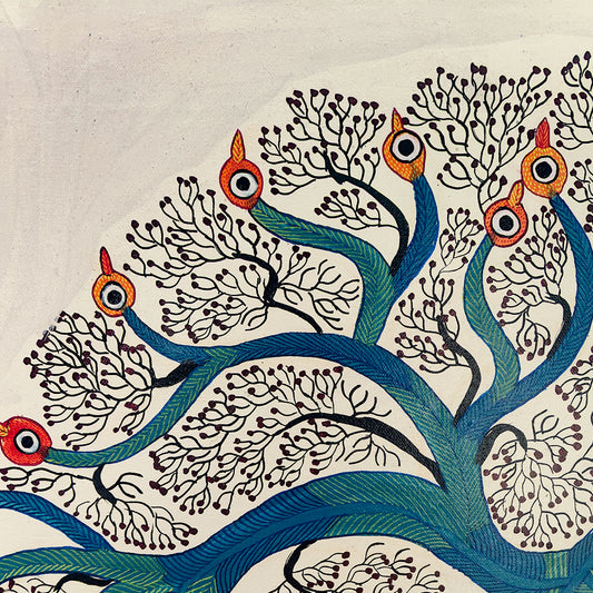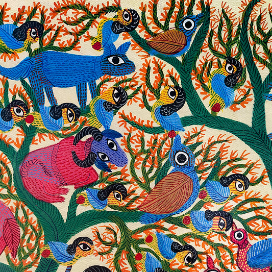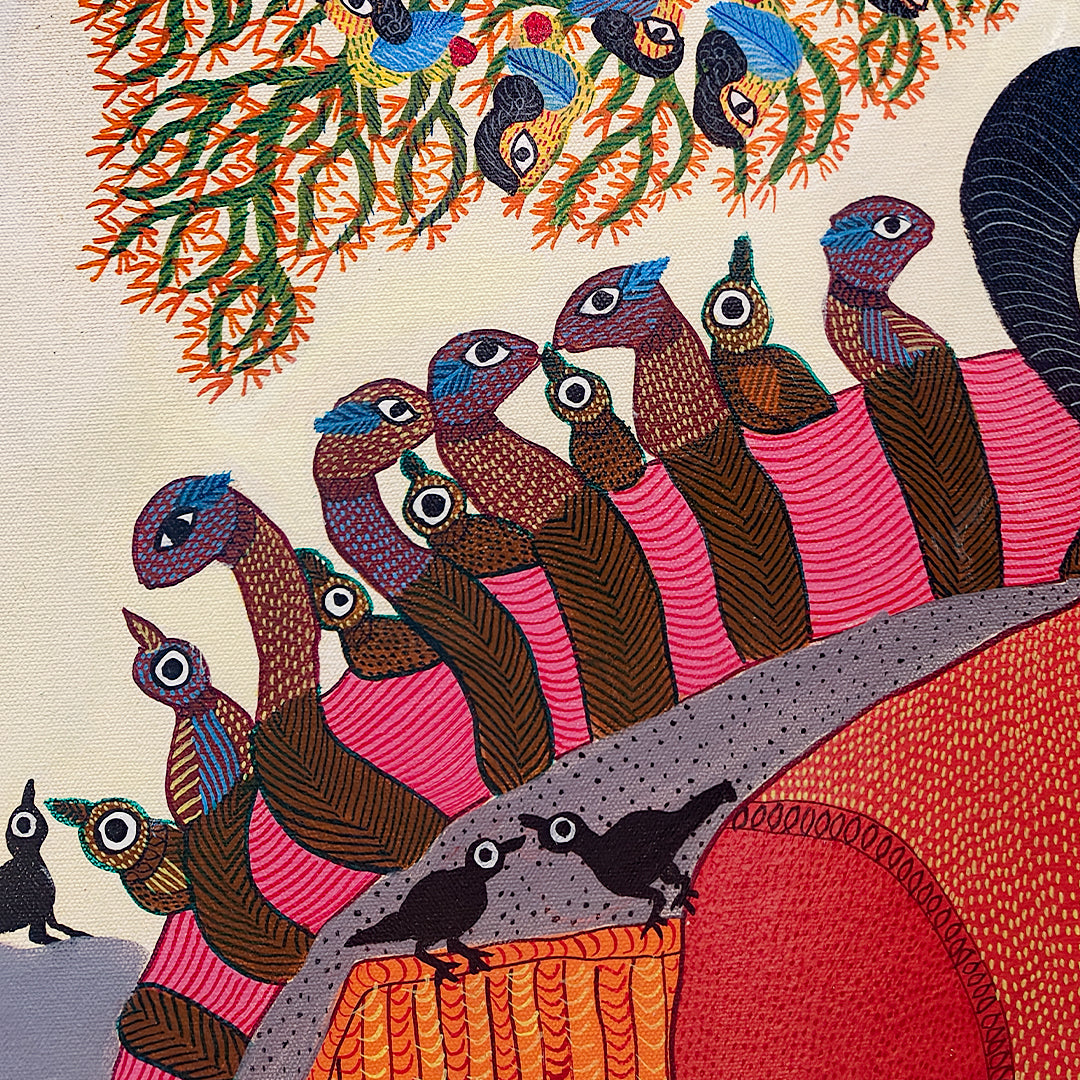 Durgabai Vyam is one of the foremost female artists working in the Pardhan-Gond tradition of tribal art. Although she lives and works in Bhopal, most of Durgabai’s work is rooted in the rich folklore and mythologies of her birthplace, Burbaspur, a village in the Mandla district of Madhya Pradesh. Her art is inspired by the stories she heard as a child from her grandmother.... Post her marriage to Subhash Vyam, she was encouraged by her brother-in-law, Jangarh Singh Shyam, who noticed her talent as a painter of digna (ritual paintings made by the women on the floors and walls of houses). He spurred her to not only translate her talents on to paper and canvas but also to experiment with her aesthetics in keeping with a contemporary urban art market. Even while using the pointillist dots, fine dashes and minute waves that characterise Pardhan-Gond painting, Durgabai’s use of vibrant colours for the stippling is part of her unique voice, and is matched by the fable-like quality of her paintings. They present a range of goddesses, rivers, trees, a variety of animals from tigers and deer to peacocks and garden lizards, and occasionally male gods – all rendered in her original and very contemporary style. Durgabai is also the author and illustrator of several books.