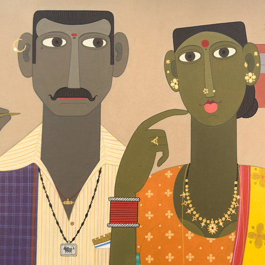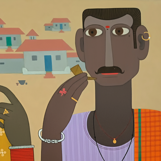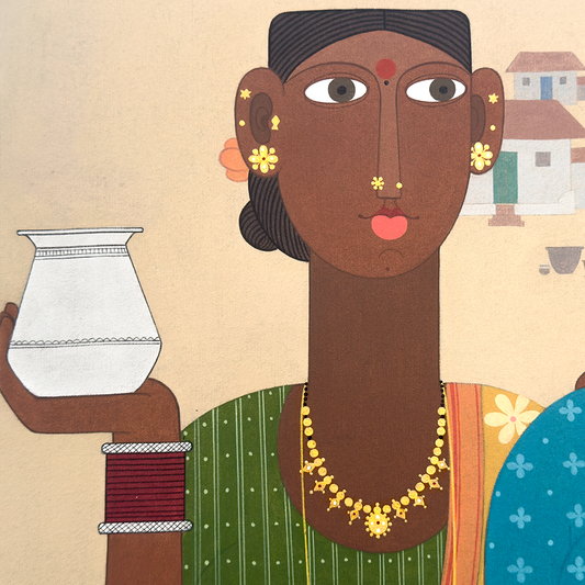 Kandi Narsimlu is a Hyderabad-based artist known for his figurative painting sportraying life in rural Telangana. Hailing from a village close to Siddipet in Telangana, Narsimlu has been passionate about art since his childhood. His paintings portray village scenes in striking intricacy. Rich in emotion and chromatic detail, Narsimlu’s work draws close attention to the often overlooked nuances of human expression as well as the facets of traditional jewellery and clothing that his characters adorn. Narsimlu uses lines and curves to depict the minutiae, including the vivid patterns on men’s and women’s clothing, their sharp facial features or the objects they carry, such as a slender umbrella, a beedi or a steel tiffin box. ... Narsimlu completed his BFA from JNT University, hyderabad and MFA JNAFA University, hyderabad. His works have been exhibited in several solo as well as group shows across Mumbai, New Delhi, Hyderabad, Bengaluru, Kolkata, Singapore and New Zealand. A recipient of several awards, Narsimlu’s work features in public and private collections such as the Rajiv Gandhi International Airport, Hyderabad; the State Bank of India; and the Salarjung Museum, among others.