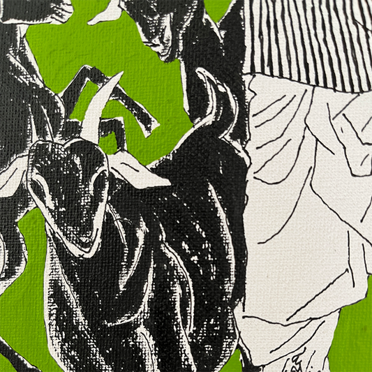 The town of Kadirenigudem in Telangana is the center of Laxman Aelay’s artistic universe. Charged with warmth and intimacy, the Hyderabad based artist’s atmospheric acrylics on canvas capture the spirit of this rural hamlet and its colorful people.... Scenes from everyday life – a shepherd at work, womenfolk gathered in conversation and couples dressed in traditional garb – come to life in Aelay’s works, made all the more dramatic with a full-bodied palette and bold patterns.