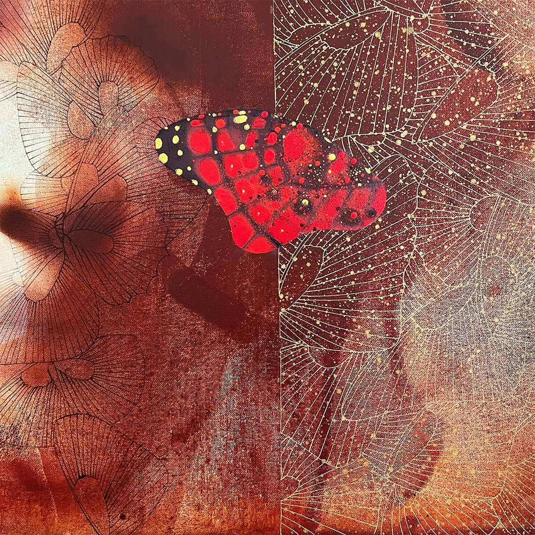 Nishant Dange take us into dreamscapes featuring otherworldly women, deep in reverie. Interwoven with intricate motifs of butterflies and birds, the mysterious and ethereal women in his art works celebrate the beauty and strength of the feminine. The omnipresent butterfly is a metaphor for the transformative and regenerative power that women possess. Dange uses a blend of charcoal, watercolours and acrylic, to create his moody, atmospheric mixed media works.... Nishant Dange depicts ethereal female figures using dark charcoal and contrasting colours that add a sense of drama. He often implements butterflies and birds using fine meticulous lines.