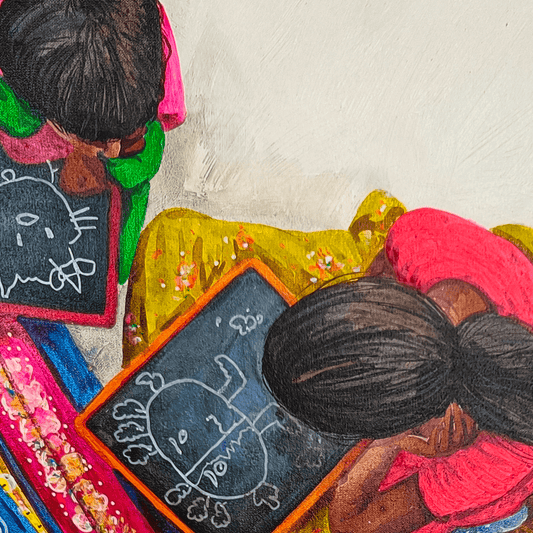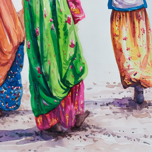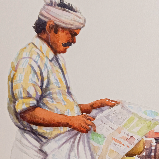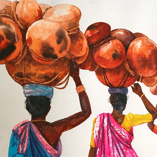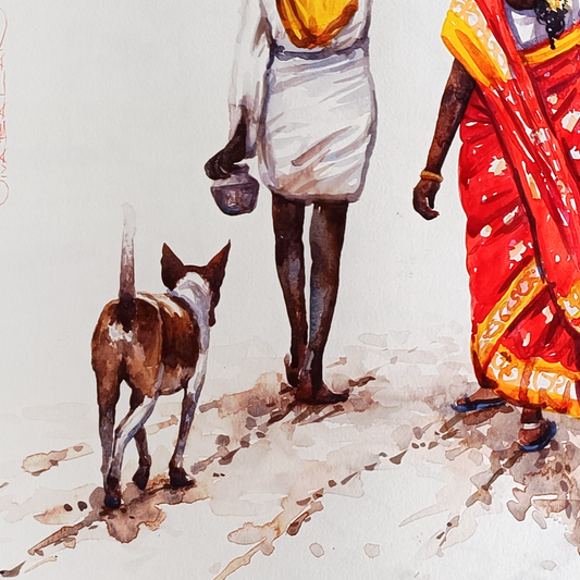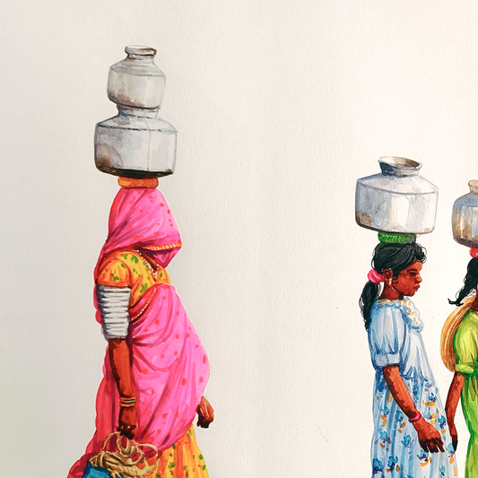 Sivabalan is a young artist, passionate about the watercolour medium and prolific in its use. His brightly coloured paintings capture the essence of pastoral life, its changing seasons, culture and festivities, and most importantly, its people. Unlike many others who choose to use earthy tones when depicting rural subjects, Sivabalan employs bright colours to compose his vignettes of everyday life.... Reminiscent of Company-period ethnographic studies, women hefting pots of water on their heads, baskets of hay and a score of other things like caparisoned elephants and village processions, bullock carts, children playing, and cycle rickshaw wallahs make up his oeuvre. Snapshots of daily life, they showcase his affinity towards his native place and present a completely different pace of life from that experienced in the city. He notes, “I was born and brought up in Kumbakonam, a town of temples surrounded by many villages. The town always had a culture of its own and a festive mood. Even today I enjoy and express it and it still influences me.”