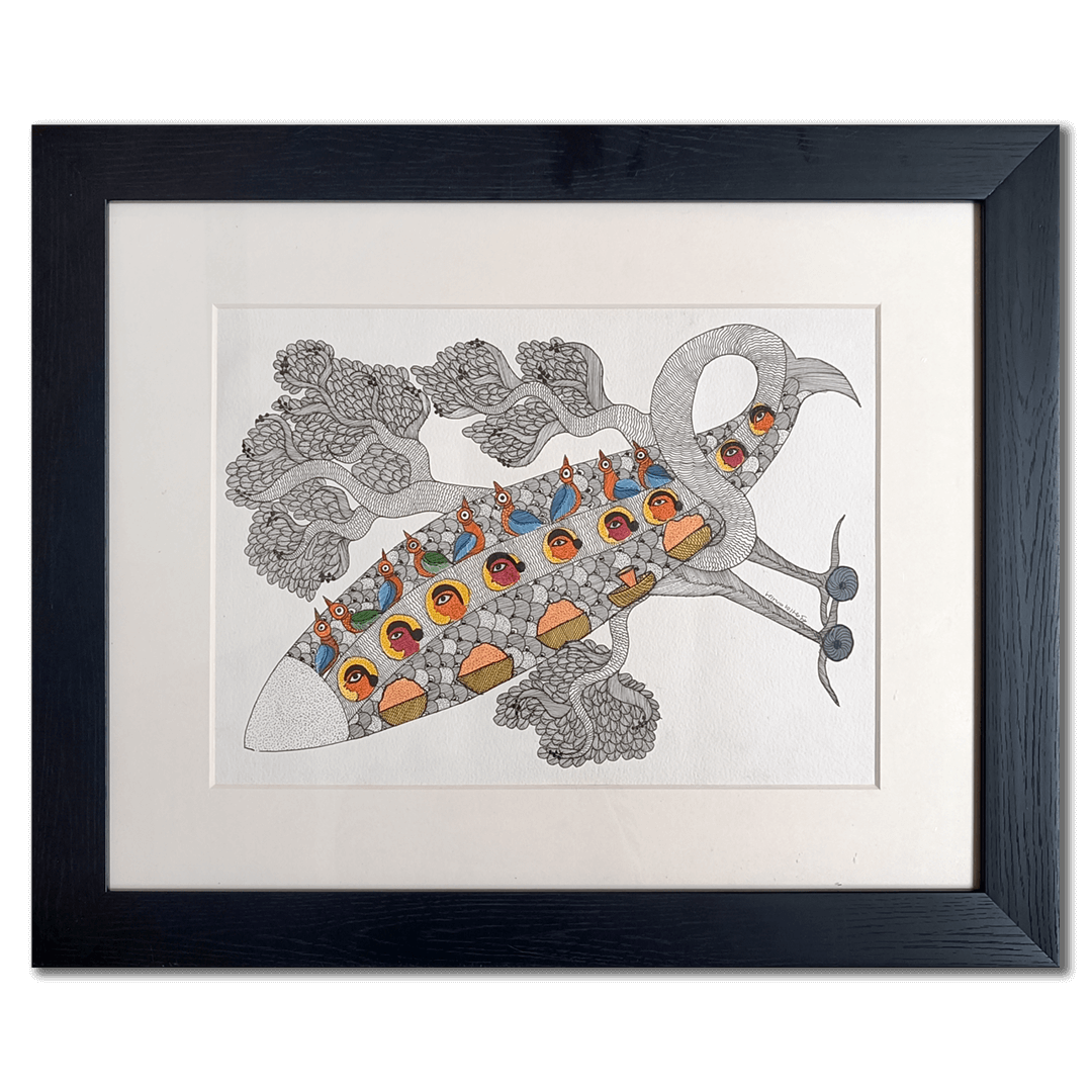 Subhash Vyam is a Pardhan-Gond artist who after his initial forays in clay and wooden sculpture began to practice the Pardhan-Gond tradition of stippled painting like his wife Durgabai and his acclaimed brother, Jangarh Singh Shyam. Particularly fond of blacks, his works are often simple ink on paper renditions. ... Even when he uses colours, Vyam often chooses to leave segments of his landscapes in black and white, with only some coloured bits. His trees, therefore, are usually rendered in black, while the birds, animals and human figures that inhabit the landscape may be coloured. Although his subjects include mythological deities and folk narratives, Vyam’s favorite subjects are aquatic life, which he learned to appreciate while growing up in the village of Sonpuri, near Patangarh. His childhood in an environment devoid of running water taught him not only of its significance as natural resource but as a parable of life. Drawing on this, Vyam authored Water, an illustrative book, part autobiography, part mythological tale and part social commentary. He has also illustrated other books, including some with his wife Durgabai.